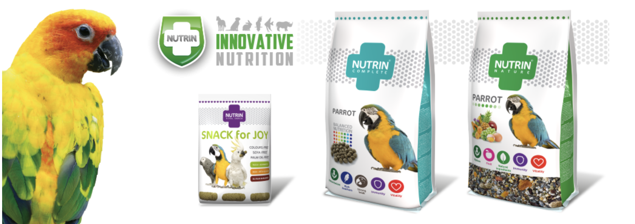 Chov papoušků s sebou přináší nejen velkou radost z obdivování těchto krásných ptáků, ale také velkou odpovědnost za jejich zdraví. Důležitá je nejen správná péče o tyto exotické ptáky, ale také jejich vyvážená a pečlivě promyšlená strava. Krmivo Nutrin pro papoušky poskytuje odpovídající množství bílkovin, sacharidů, tuků, vitamínů a minerálů, které jsou nezbytné pro udržení zdraví každého papouška.