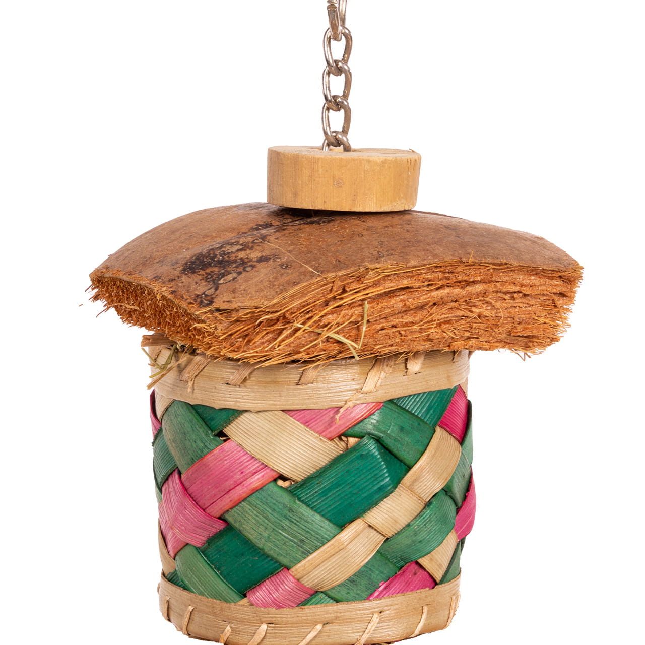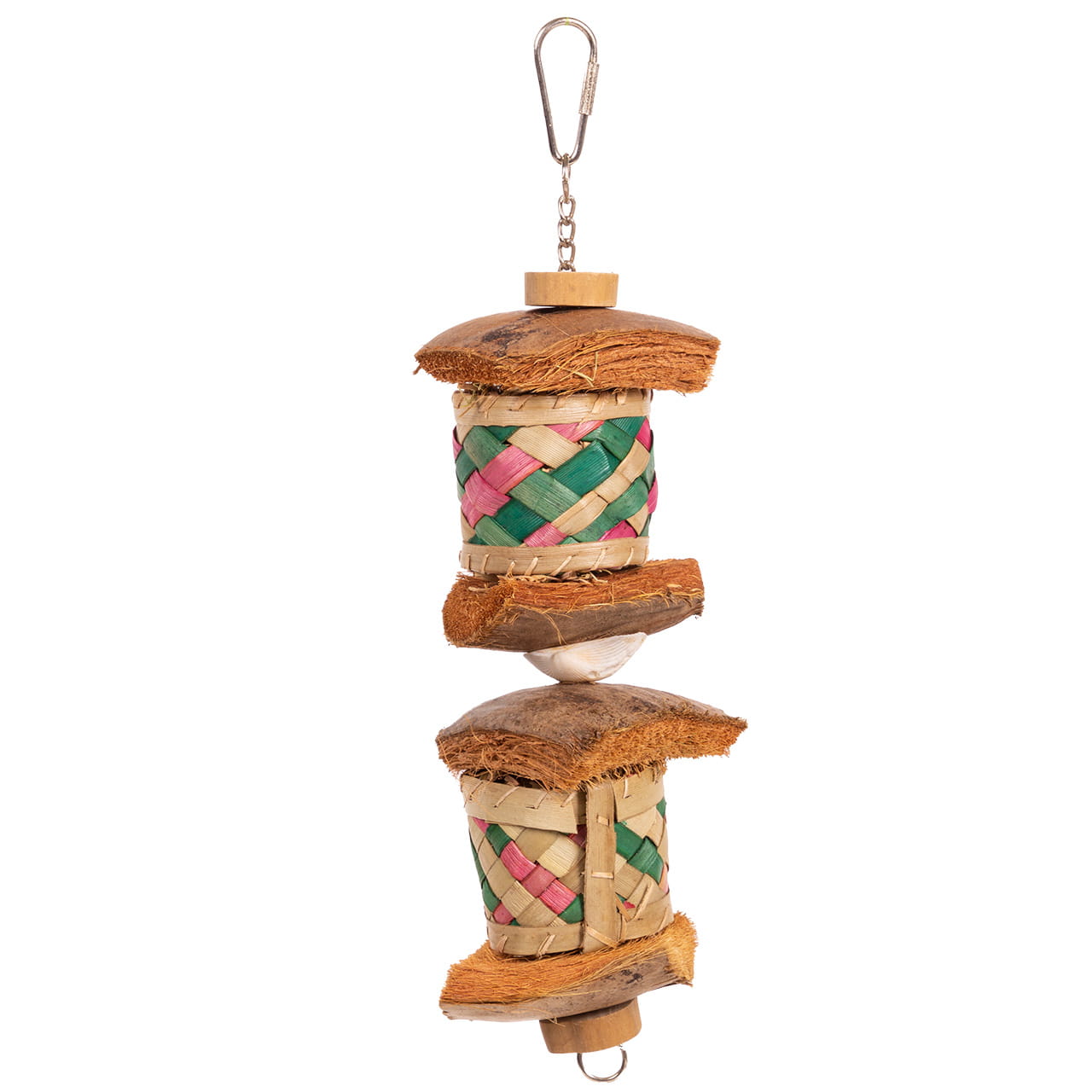 Různé složky: Hračka je vyrobena z přírodních materiálů, jako je dřevo, skořápka kokosového ořechu, sizal a nerezová ocel. Každý z těchto prvků poskytuje různé textury a smyslové zážitky, které zaujmou vašeho opeřeného přítele.