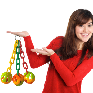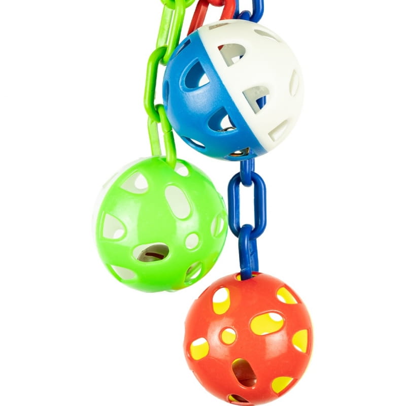 3 míčky s chrastítkem na barevných řetízcích – hračka pro střední a velké papoušky