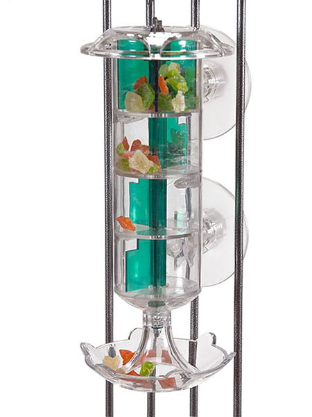 Péče o blaho / Nauka krmení : 5 v 1 má 4 samostatné úrovně na krmivo, díky čemuž můžete do klece svého opeřeného přítele dávat pestrou stravu. Doporučujeme, aby krmítko nahradilo jednu z tradičních misek, díky čemuž bude papoušek při získávání potravy muset přemýšlet a plánovat – přesně jako v přírodě! Papoušek tak bude mít na dlouhou dobu co dělat, což zabrání nudě (doporučujeme používat krmítko zejména když není pečovatel doma) a tím zvýšíme jeho pohodu.