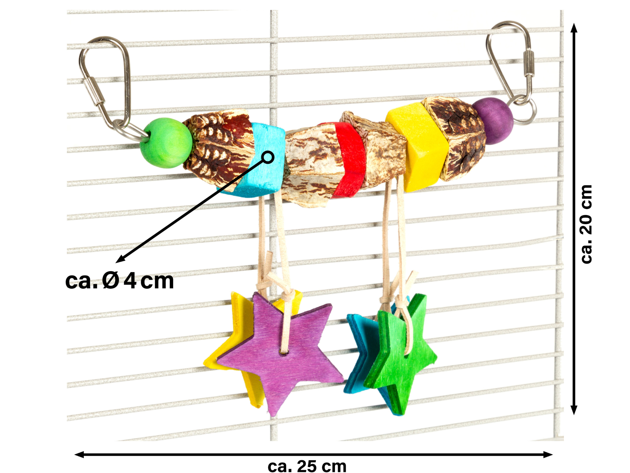Hračka je vyrobena z různých dřevěných prvků a kousků tvrdého mahagonu – dřeva známého svou trvanlivostí a odolností proti klování. Právě ty jsou hlavní atrakcí pro intenzivní žvýkání a přirozenou stimulaci. Další atrakcí jsou dva kožené pásky, na kterých jsou zavěšeny dekorativní, lehké dřevěné hvězdičky – ideální pro uchopení, otáčení a zkoumání zvědavými zobáky.