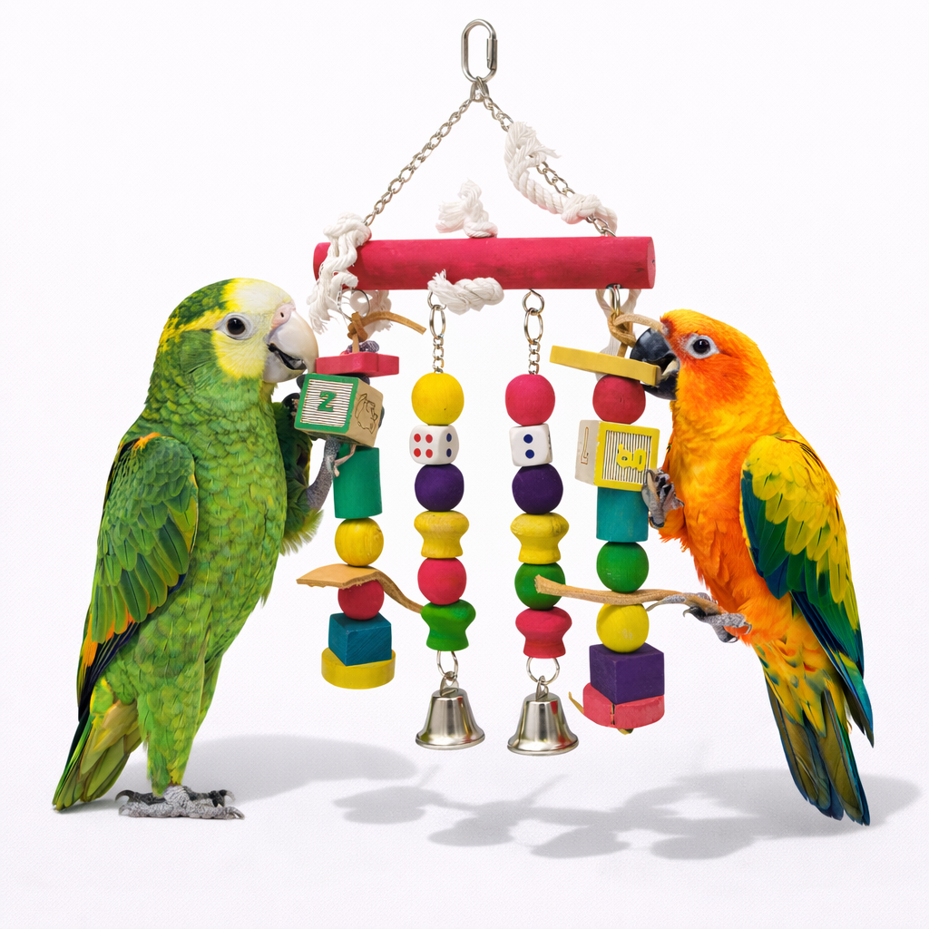 Barevná, super dřevěná, pestrobarevná hračka ze dřeva, s provázky, spoustou chrastících dřevěných korálků a zvonkem pro střední a malé papoušky.
