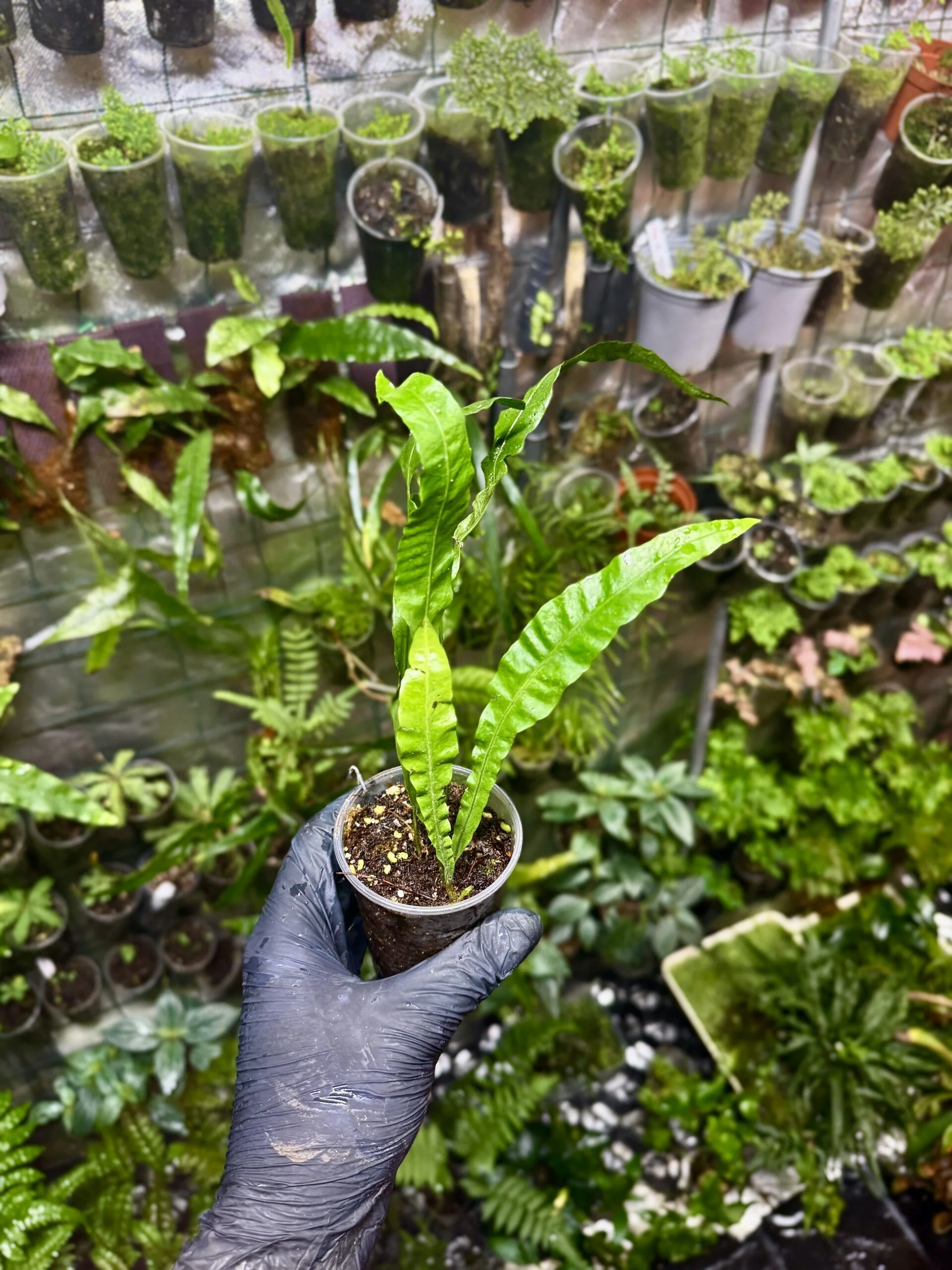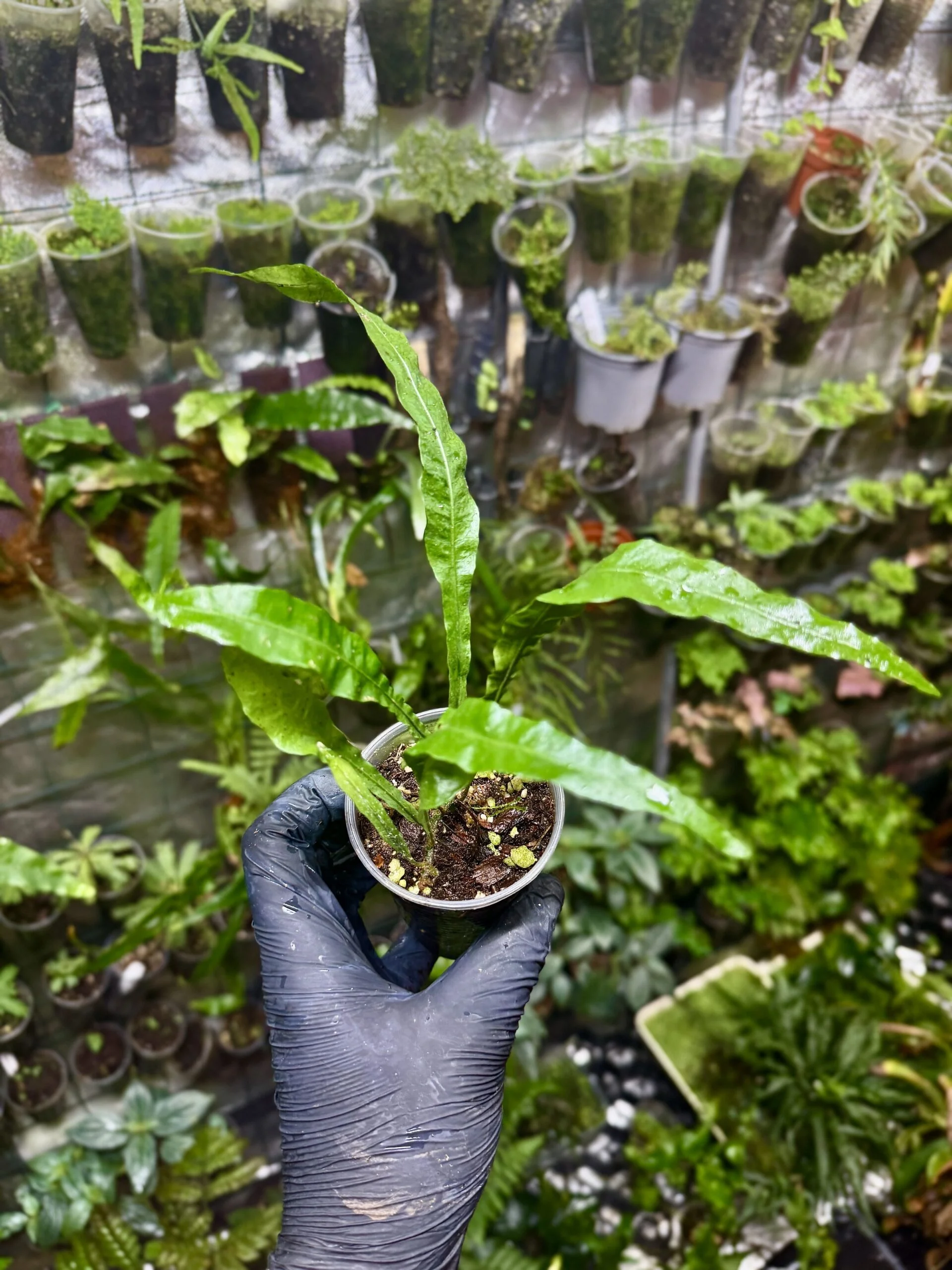 Listy jsou úzké, kopinaté, se zašpičatělými konci a jejich intenzivní tmavě zelená barva vytváří elegantní kontrast v aranžmá. Rostlina roste pomalu, ale při správné vlhkosti a teplotě se rozvíjí do hustých trsů, které dodávají strukturu a hloubku vlhkým teráriím a lesům ve skle.
