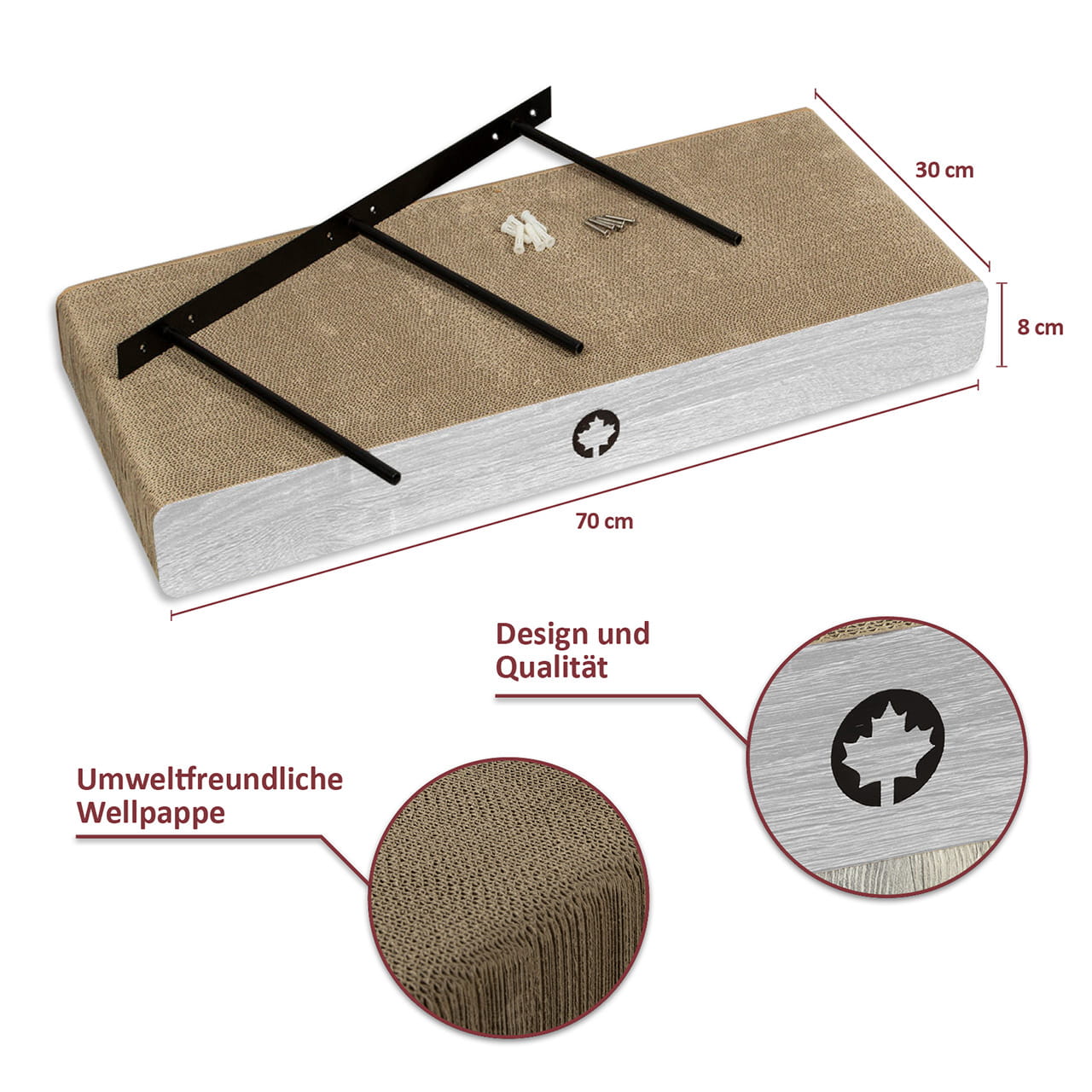 Důležitá informace týkající se rozsahu dodávky: Upozorňujeme, že některé ilustrace mohou zobrazovat příklad montáže na zeď. Prodejní cena se vztahuje na tři škrabadla na zeď včetně tří nástěnných držáků z práškově lakované oceli.