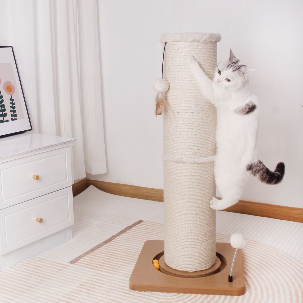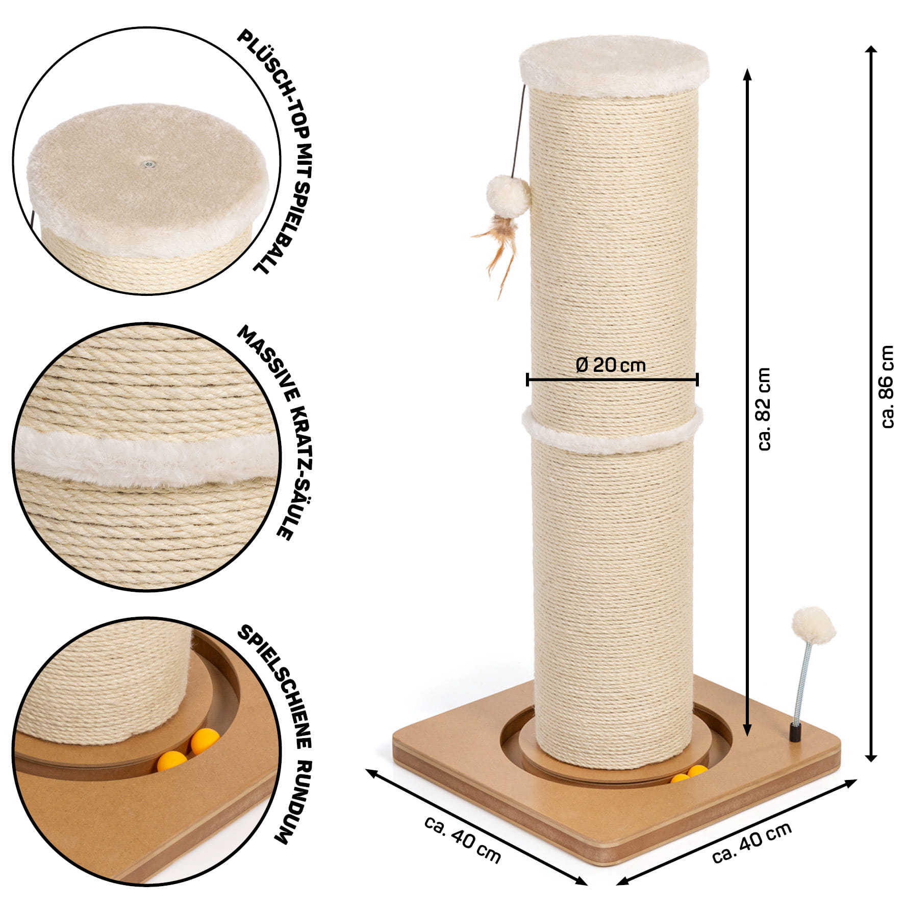 - Škrabací sloup: Pevná konstrukce o průměru 20 cm, ideální pro protahování a škrábání.