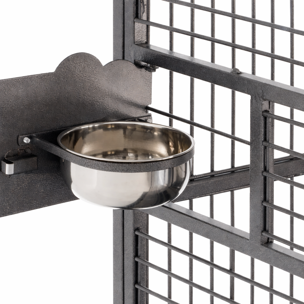 - Pohodlné krmení: Otočné misky z nerezové oceli umožňují snadné doplňování krmiva a vody.