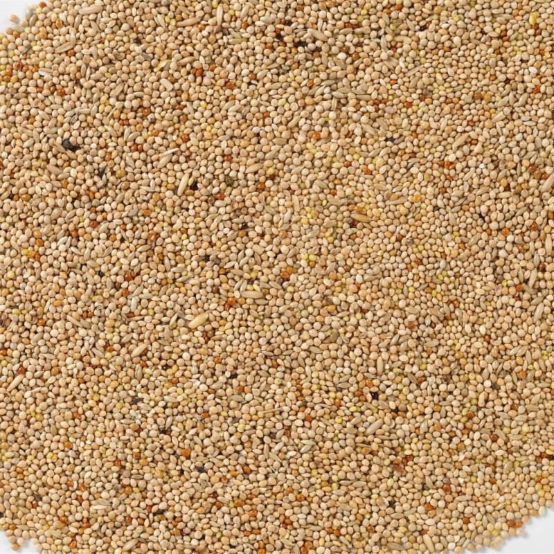 Složení: žluté proso 45 %, bílé proso 40 %, loupaný oves 5 %, alpiste 5 %, červené proso 5 %