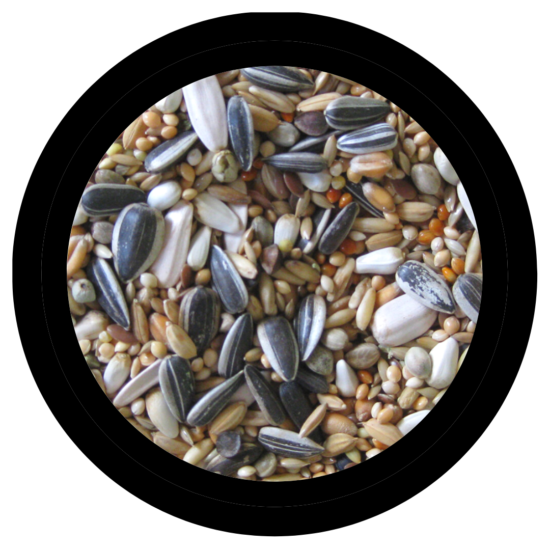 Žluté proso, pšenice, loupaný oves, kanár, pruhovaná slunečnice, bílá slunečnice, lněné semínko, šafrán, červené proso, semena konopí, rýže, pohanka, bílé proso