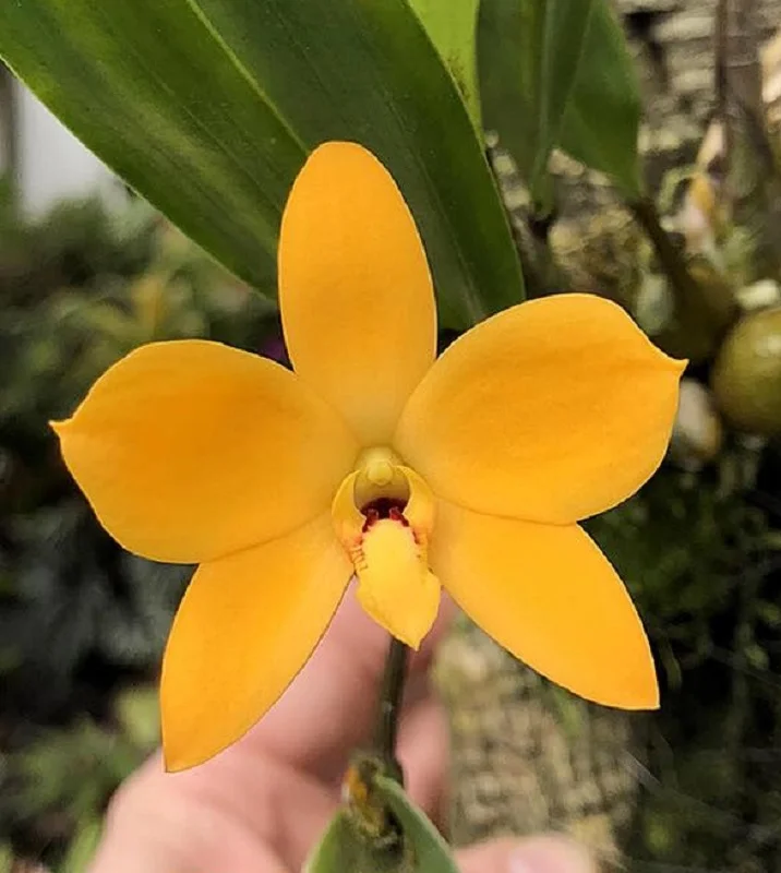 Vzácný epifytický orchidej z Nové Guineje, ceněný sběrateli pro svůj jedinečný vzrůst a neobvyklý tvar květů. Květy jsou intenzivně žluté, s širokými okvětními lístky a jedinečným pyskem charakteristickým pro tento druh. I když jsou krátkodobé, za vhodných podmínek se objevují pravidelně po celou sezónu. Rostlina preferuje vlhké, dobře větrané prostředí s mírným osvětlením a krátkými obdobími sucha. Díky kompaktním rozměrům se skvěle hodí do tropických terárií jako prvek vertikální kompozice.