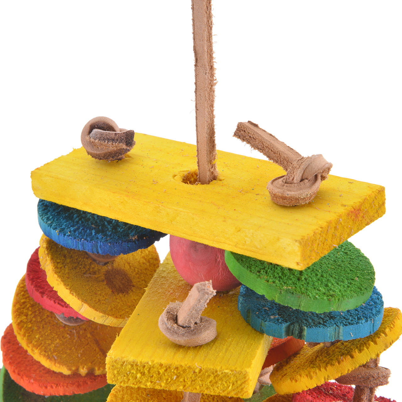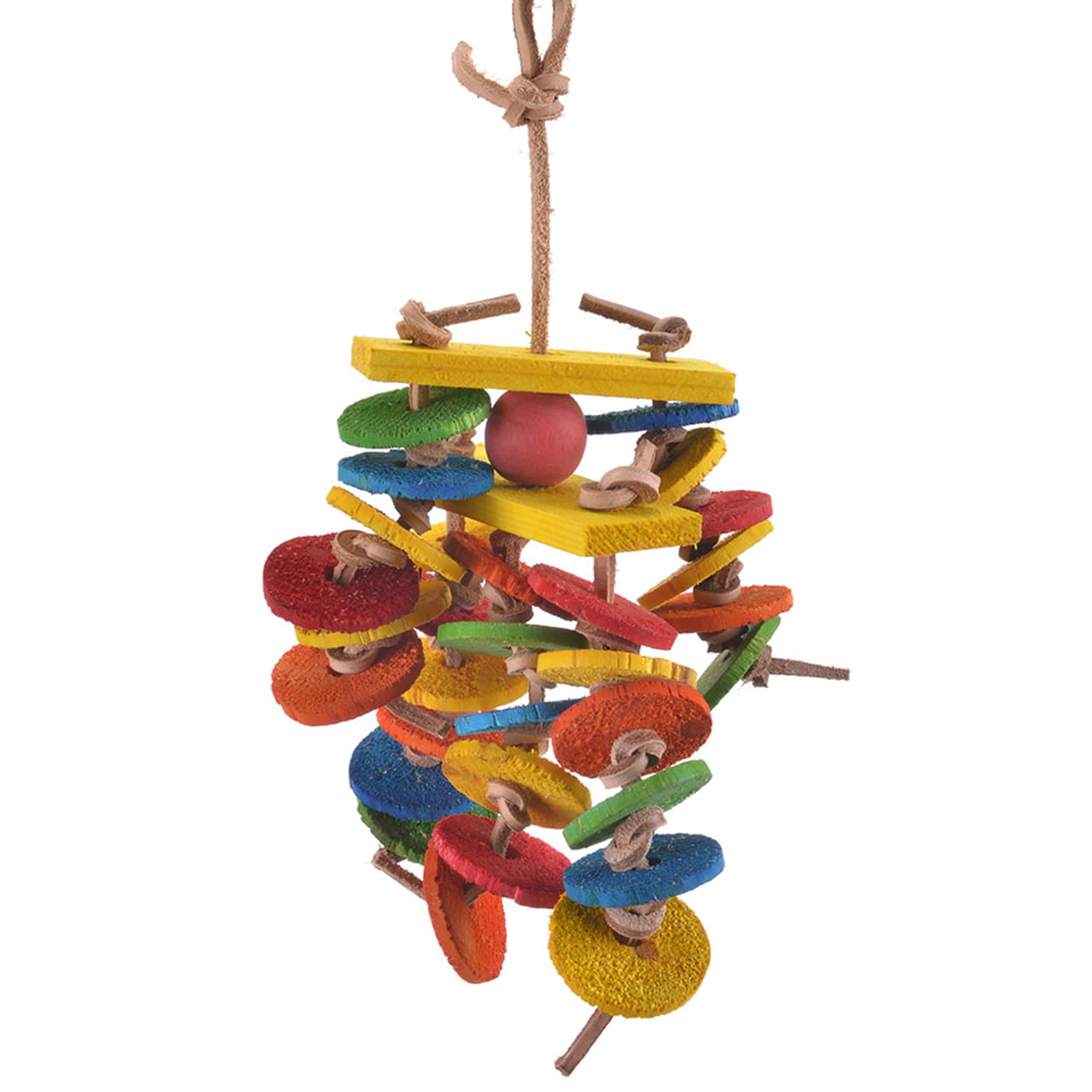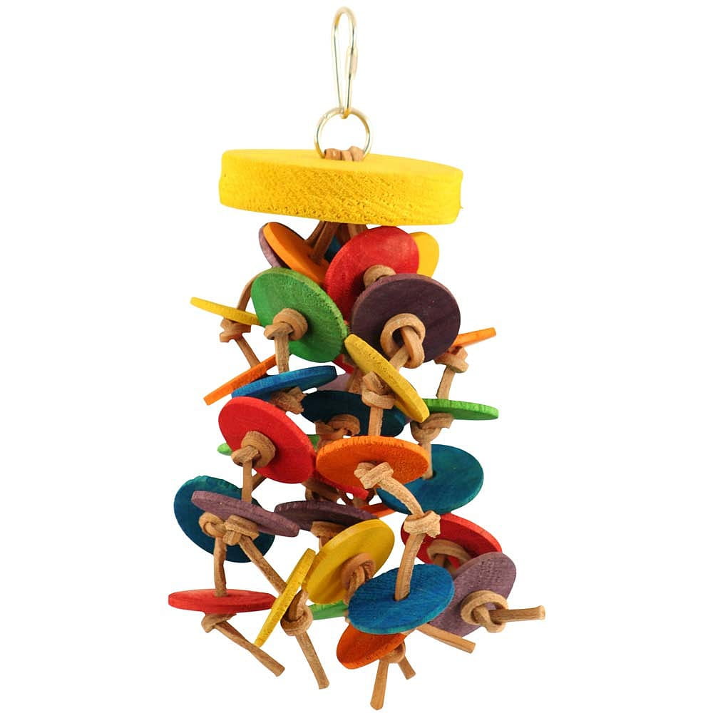 Hračka s dřevěnými disky a uzly je jednou z nejoblíbenějších kombinací tvarů a materiálů v hračkách pro papoušky. Hračka je univerzální a všestranná.