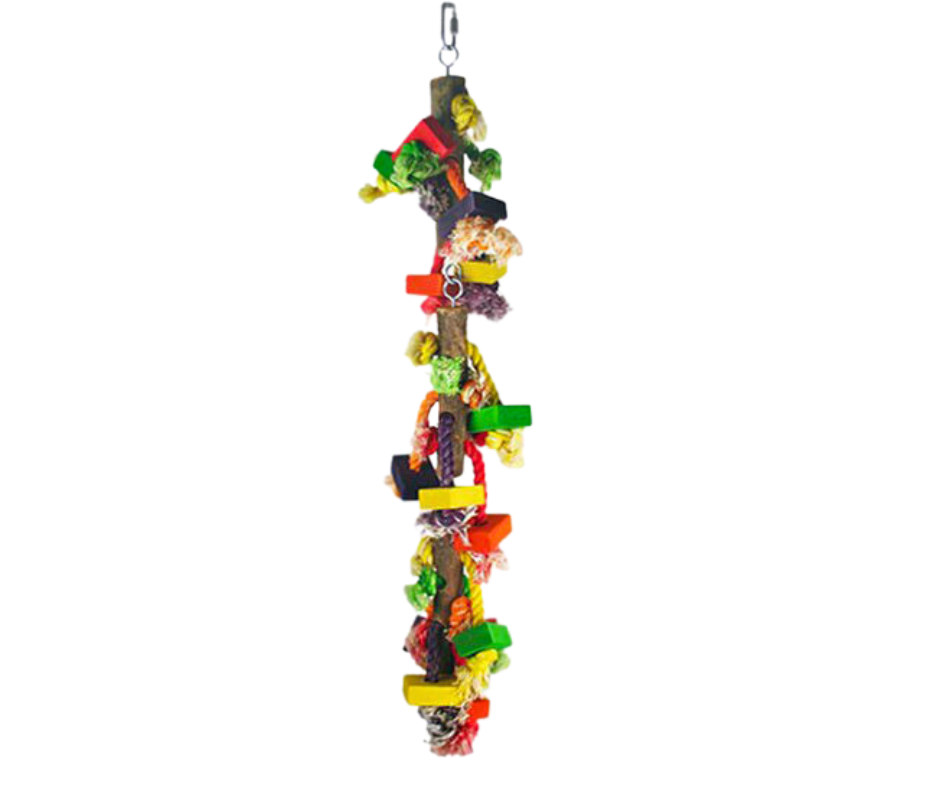 Přírodní hračka: Hračka je vyrobena z přírodního dřeva a bavlněných provázků, díky čemuž je bezpečná a šetrná k vašim papouškům. Je ideální alternativou k umělým hračkám, které často obsahují toxické složky.