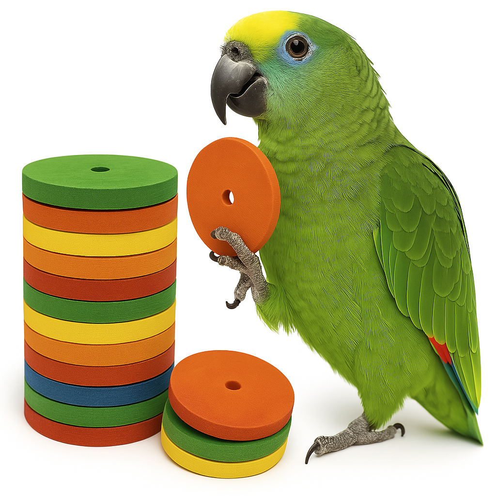 Disky mají průměr 4 cm, tloušťku 2,4 cm a výšku 0,9 cm. Vaše papoušek je snadno uchopí a manipuluje s nimi, což zajišťuje stimulující trénink pro jeho zobák a mysl.