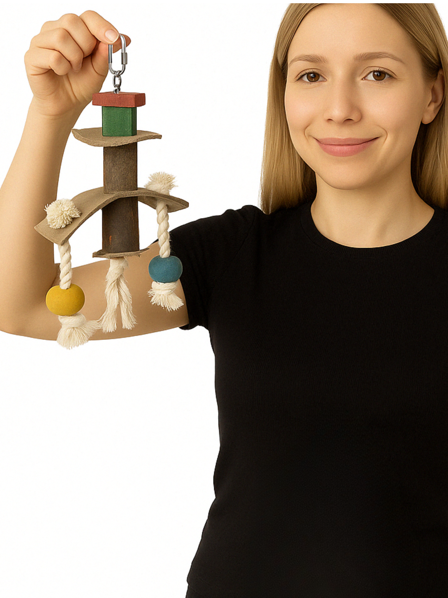Univerzální a bezpečná: Hračka byla navržena tak, aby vyhovovala všem papouškům bez ohledu na jejich druh. Kromě toho jsou materiály použité k její výrobě, jako je dřevo, bavlna, sisal, nerezová ocel a potravinářské barviva, pro vašeho papouška bezpečné.