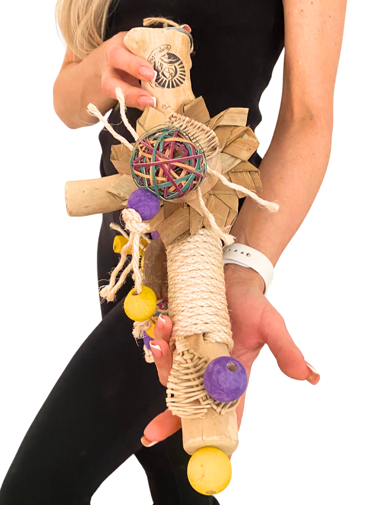 Přírodní bidélko pro ptáky „Explorer Tropics“ je jedinečná, ručně vyrobená hračka do klecí pro ptáky, která kombinuje funkce bidýlka a stimulační hračky. Díky použití přírodních materiálů, jako je dřevo, sizal a ratanové proutí, je tato hračka dokonalým doplňkem klece, který zajišťuje jak pohodlný odpočinek, tak možnost hry. Barevné kuličky a různé textury povzbuzují ptáky k interakci, žvýkání a podporují jejich duševní vývoj. Ideální pro papoušky a jiné středně velké ptáky.
