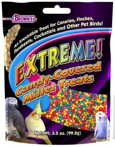 Proso Brown's® Extreme™ pokryté cukrovou, sladkou a barevnou vnější vrstvou, která stimuluje a přináší potěšení při jídle. Chutná skvěle a může být ideální tréninkovou pochoutkou, svačinkou nebo odměnou, které ptáci nebudou moci odolat!