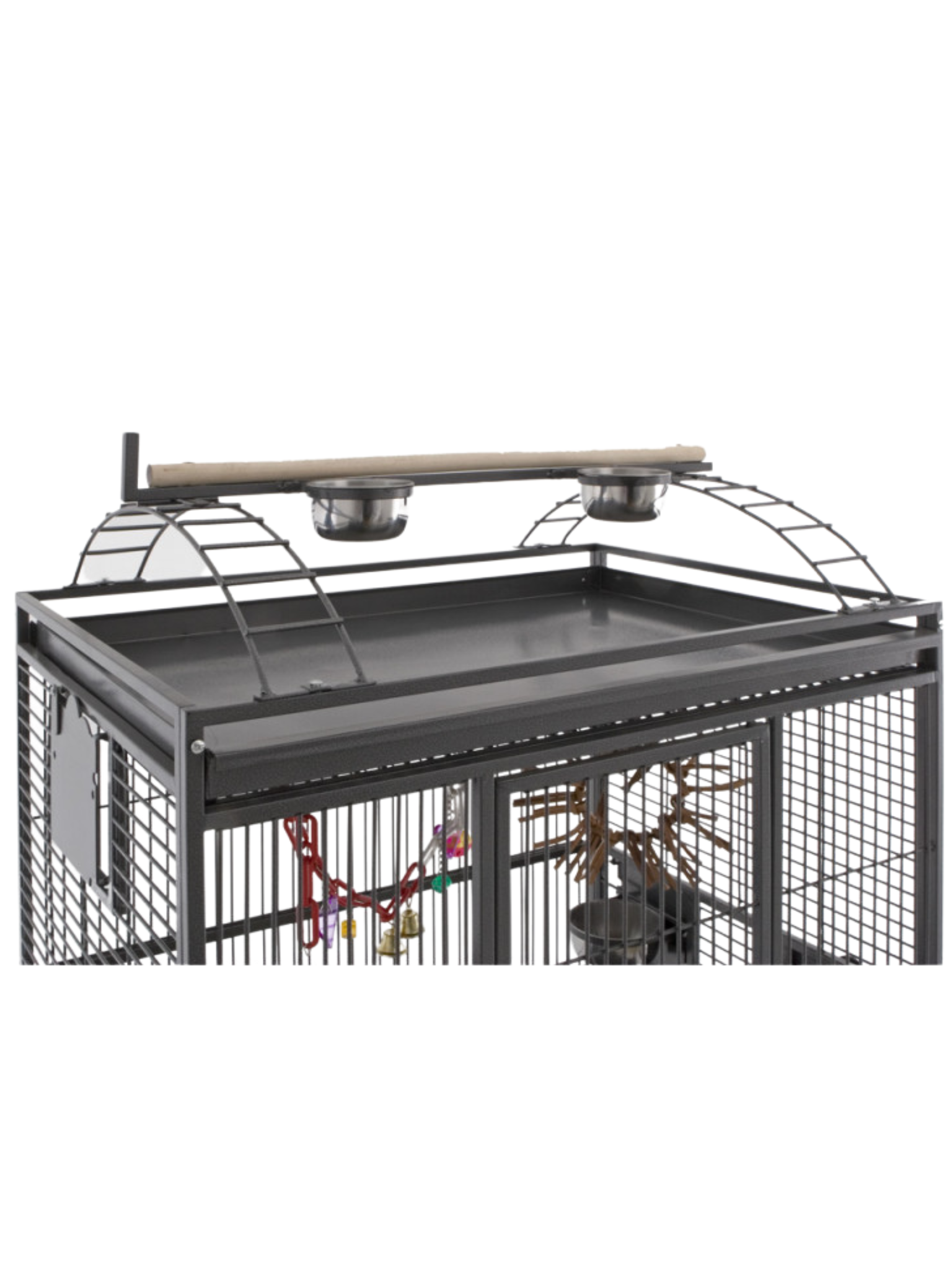 - Horní hřiště s vestavěnou podložkou, které ptákům poskytuje další prostor pro aktivitu.