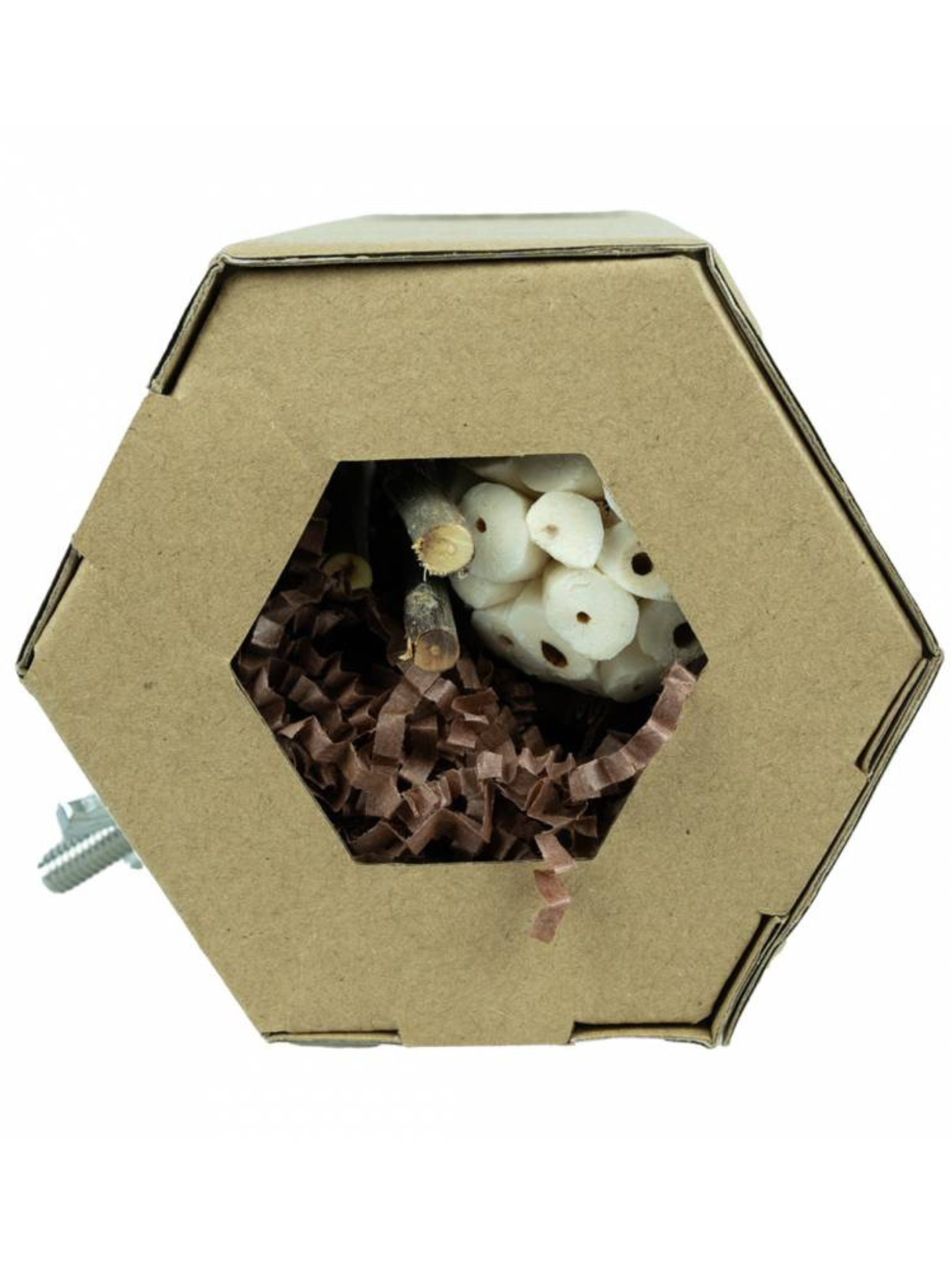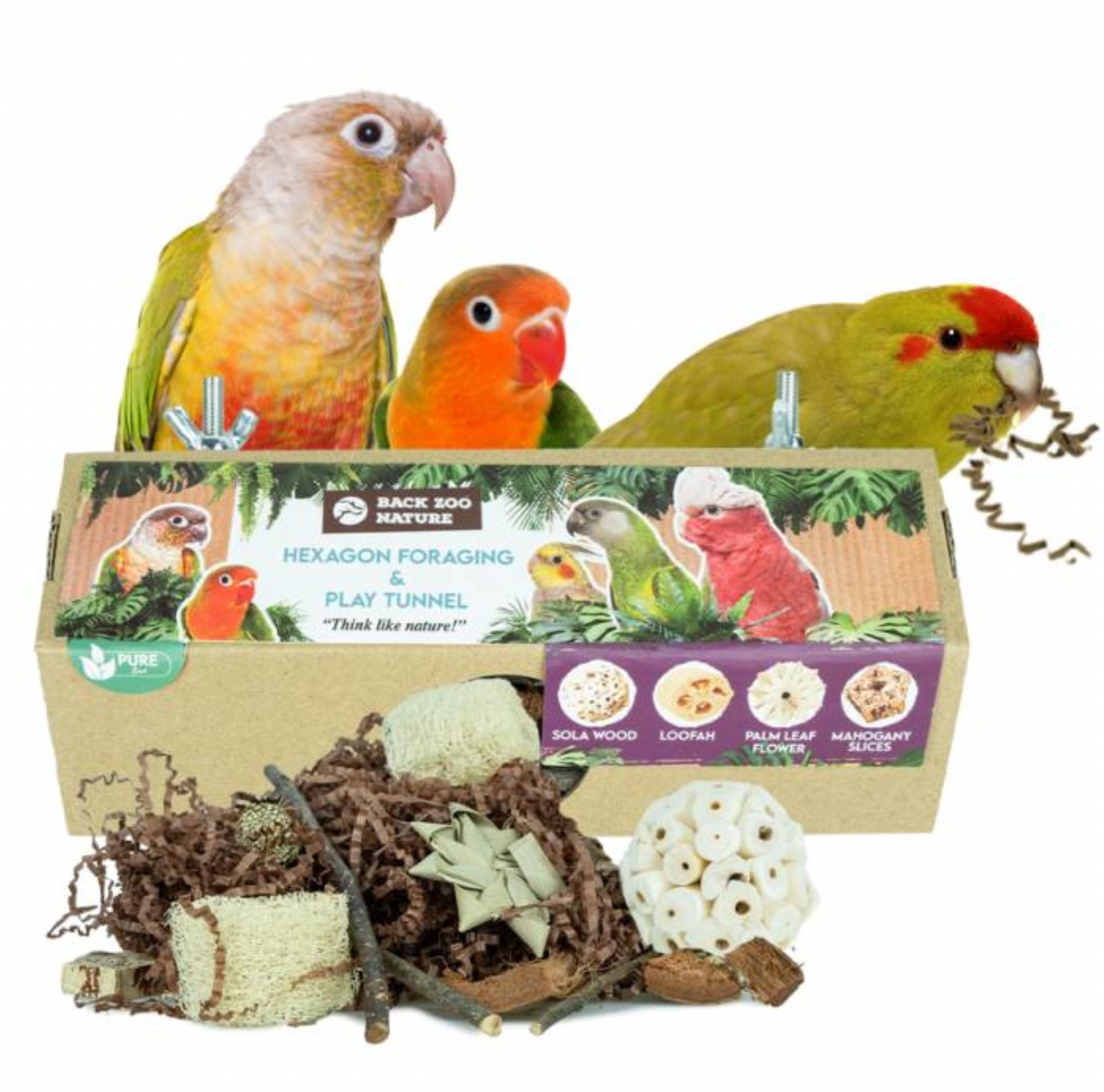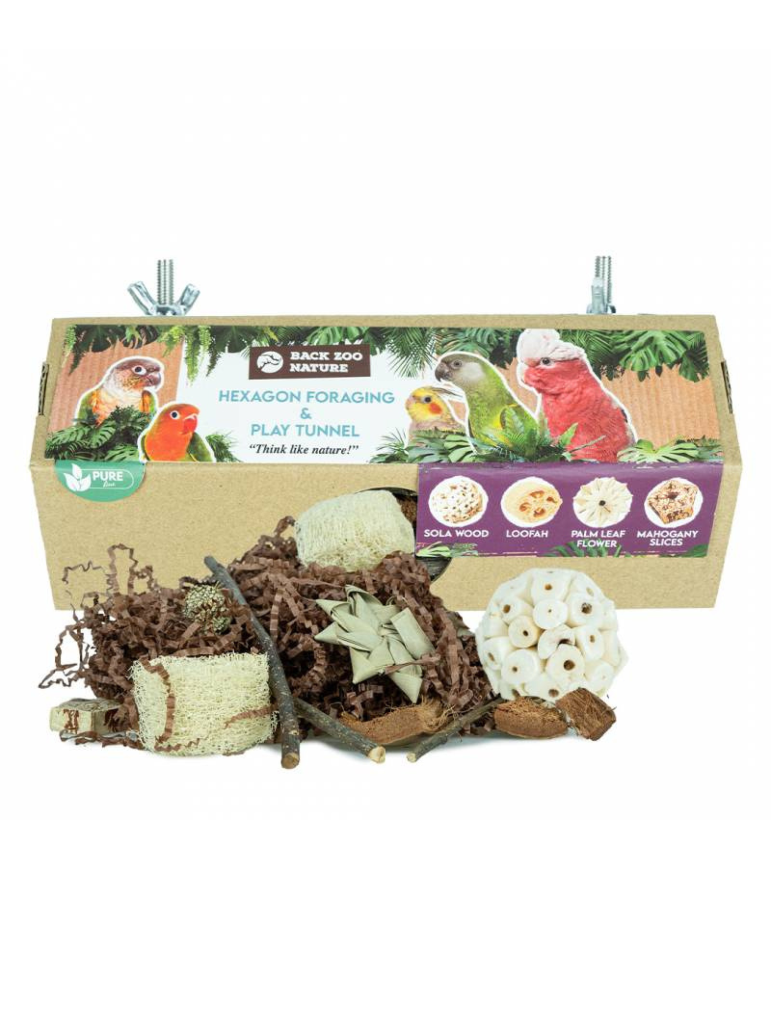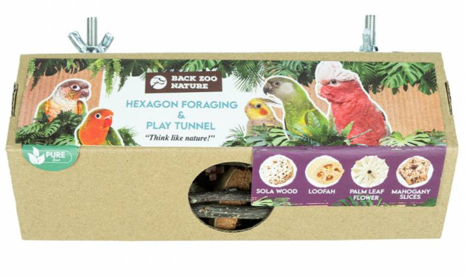 Hexagon Foraging & Play Tunnel je jedinečná hračka vytvořená pro papoušky, kteří milují objevování a žvýkání. Šestiúhelníkový tunel je naplněn různými přírodními materiály – krepovým papírem, solovým dřevem, listy lofohy, palmy a mahagonu, které vybízejí k žvýkání, hledání a objevování. Díky jednoduché montáži tunel snadno připevníte do klece.