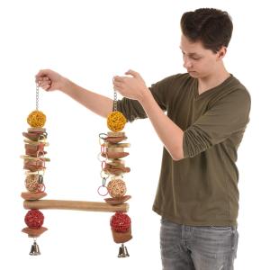 K závěsům jsou připevněny kokosové ořechy a bambus, aby se zvýšil zájem papouška. Hrazda je vyrobena z nejkvalitnějšího jávského dřeva.