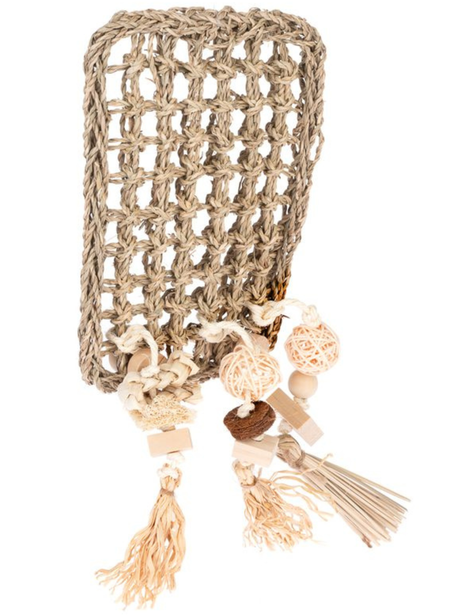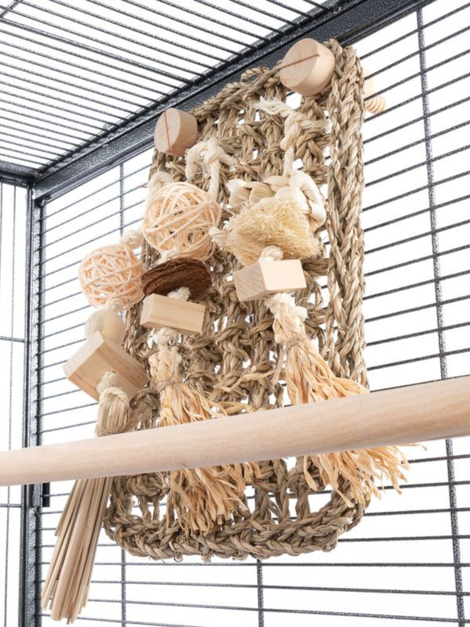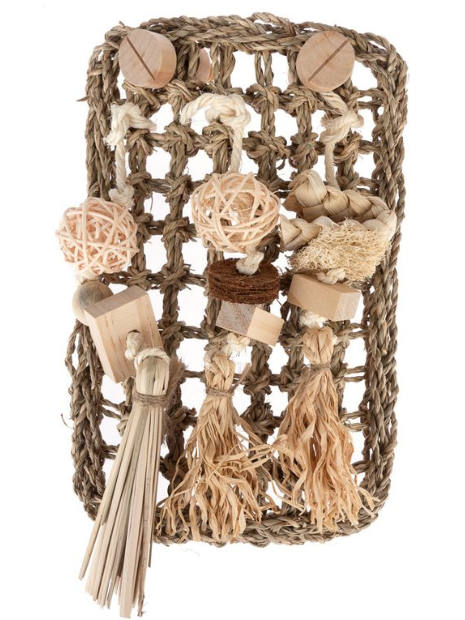 Herní stěna z mořské trávy pro střední a velké papouškyHerní stěna z mořských řas je ideálním doplňkem pro střední a velké papoušky, který jim zajistí hodiny aktivity a zábavy. Je vyrobena z přírodních materiálů, jako je mořská tráva, dřevo, ratan, kokosové vlákno, rafia a luffa, a nabízí papouškovi různé textury pro krmení a péči o zobák.
