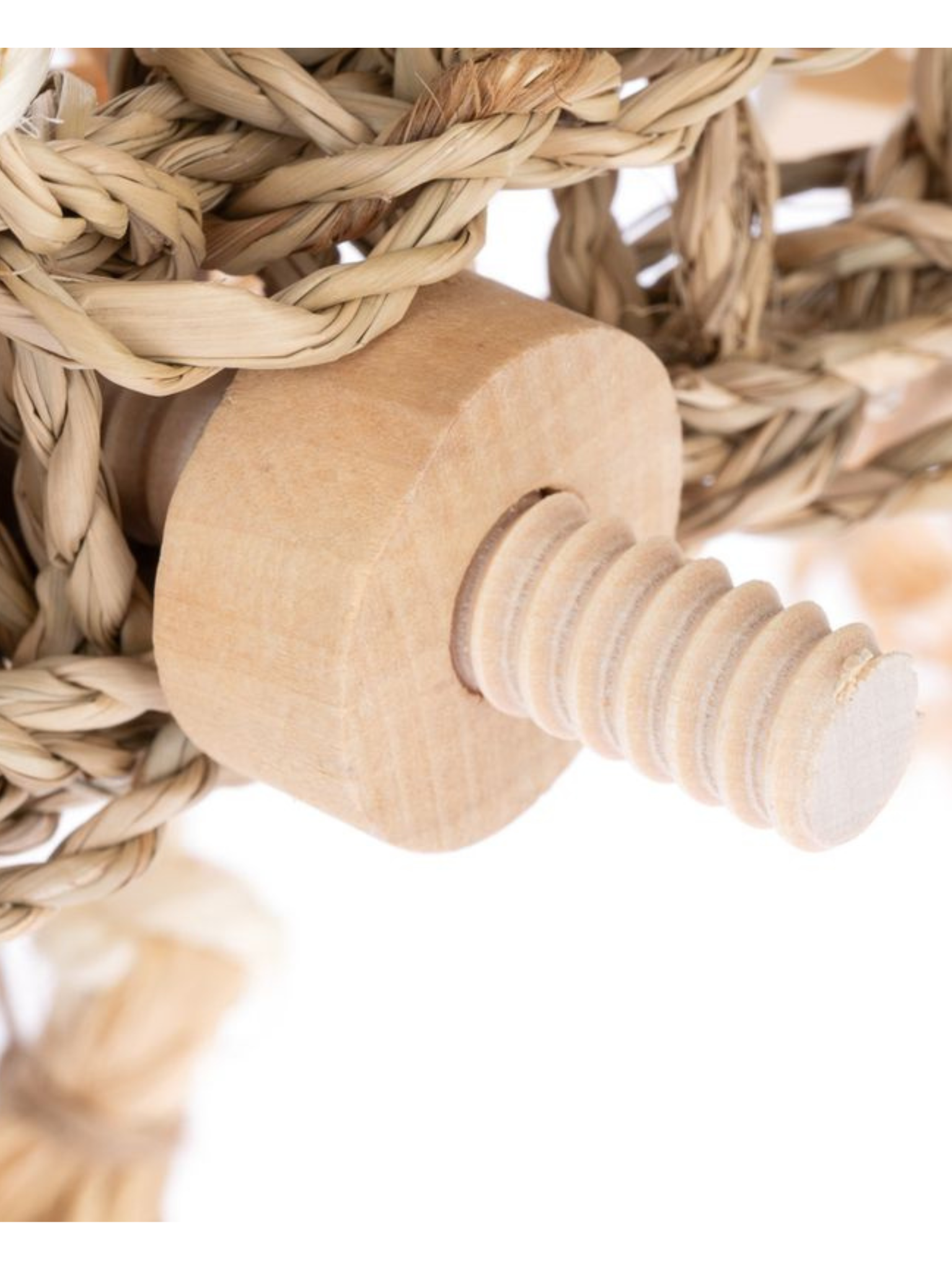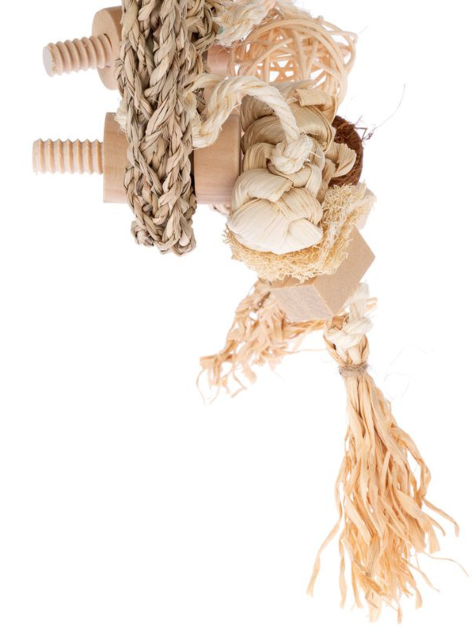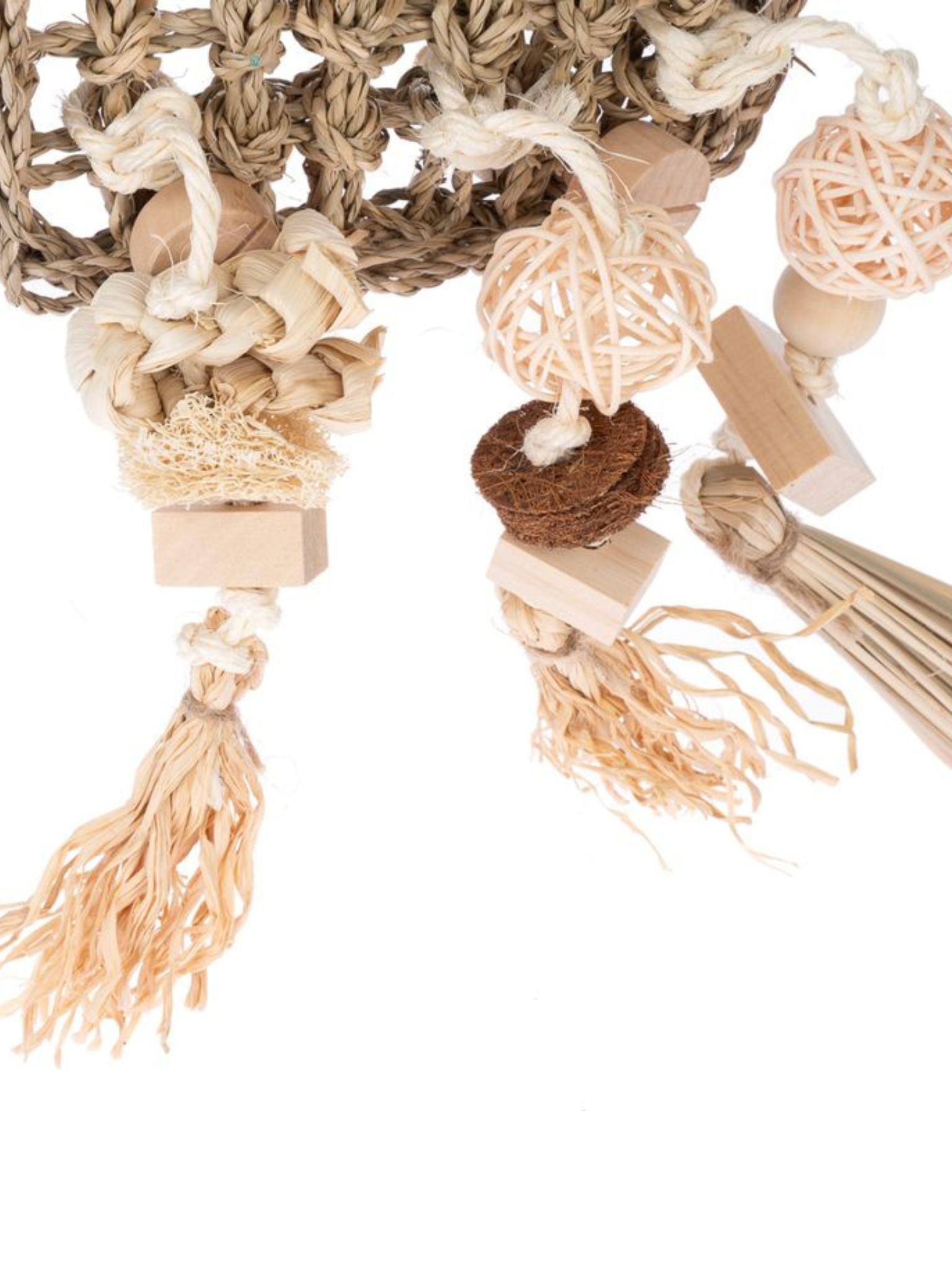 Herní stěna z mořské trávy pro střední a velké papouškyHerní stěna z mořských řas je ideálním doplňkem pro střední a velké papoušky, který jim zajistí hodiny aktivity a zábavy. Je vyrobena z přírodních materiálů, jako je mořská tráva, dřevo, ratan, kokosové vlákno, rafia a luffa, a nabízí papouškovi různé textury pro krmení a péči o zobák.