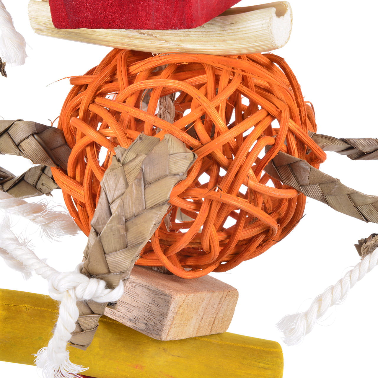 Díky barevným dřevěným kostkám, ratanovým kuličkám a zabudovanému materiálu má váš papoušek na výběr z mnoha možností, kde začít kousat a ničit