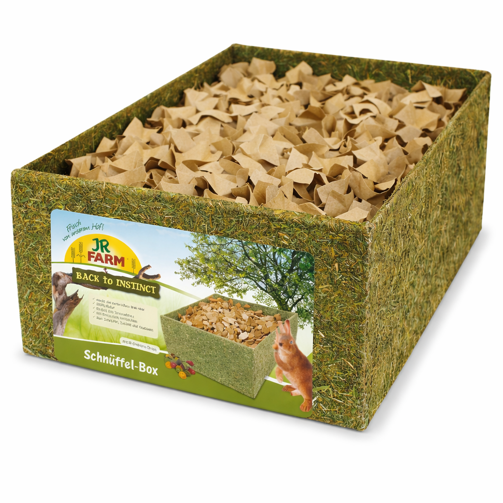 Díky krmítku můžete papouškovi dopřát spoustu zábavy . Přiložené JR Grainless Drops můžete schovat do papírových prvků v různých hloubkách a sledovat, jak papoušek okamžitě začne hledat potravu. To zahání nudu a také pomáhá snižovat stres. Samotná krabička i papírové štěpky nejsou chemicky ošetřeny, a proto je papoušek může okusovat. Krabičku lze samozřejmě naplnit i jinými výplňovými materiály, jako je sláma, písek, seno atd.