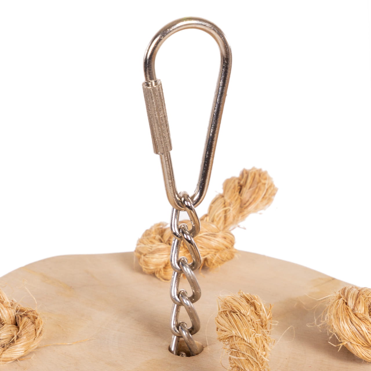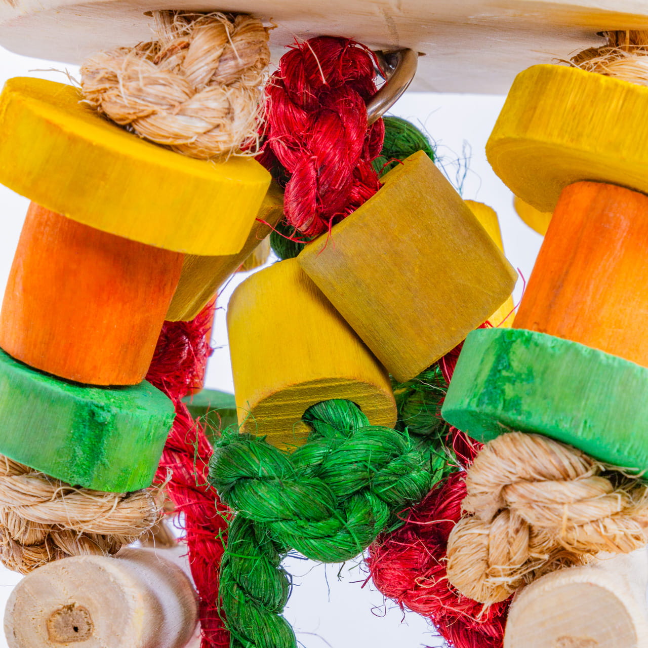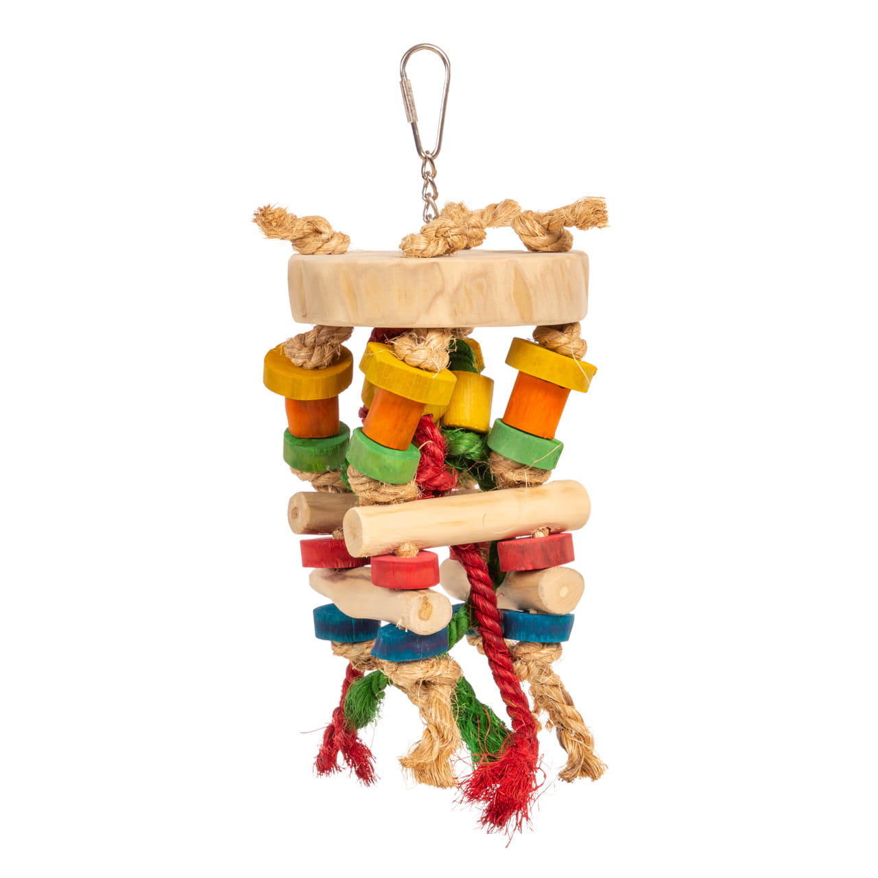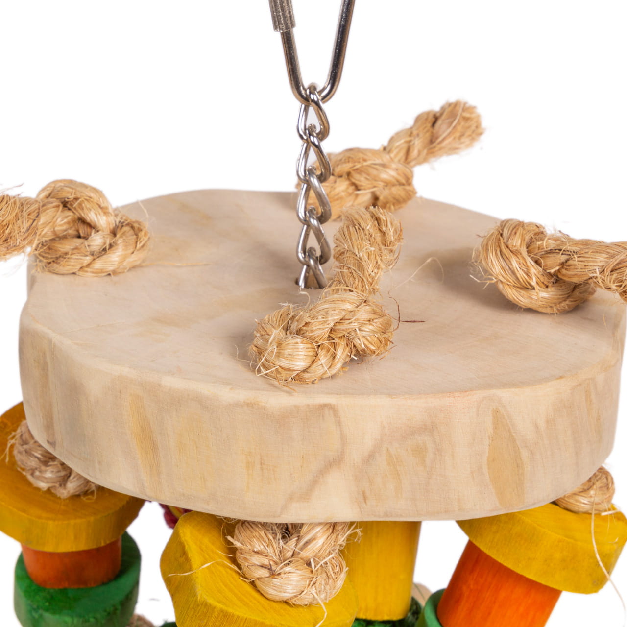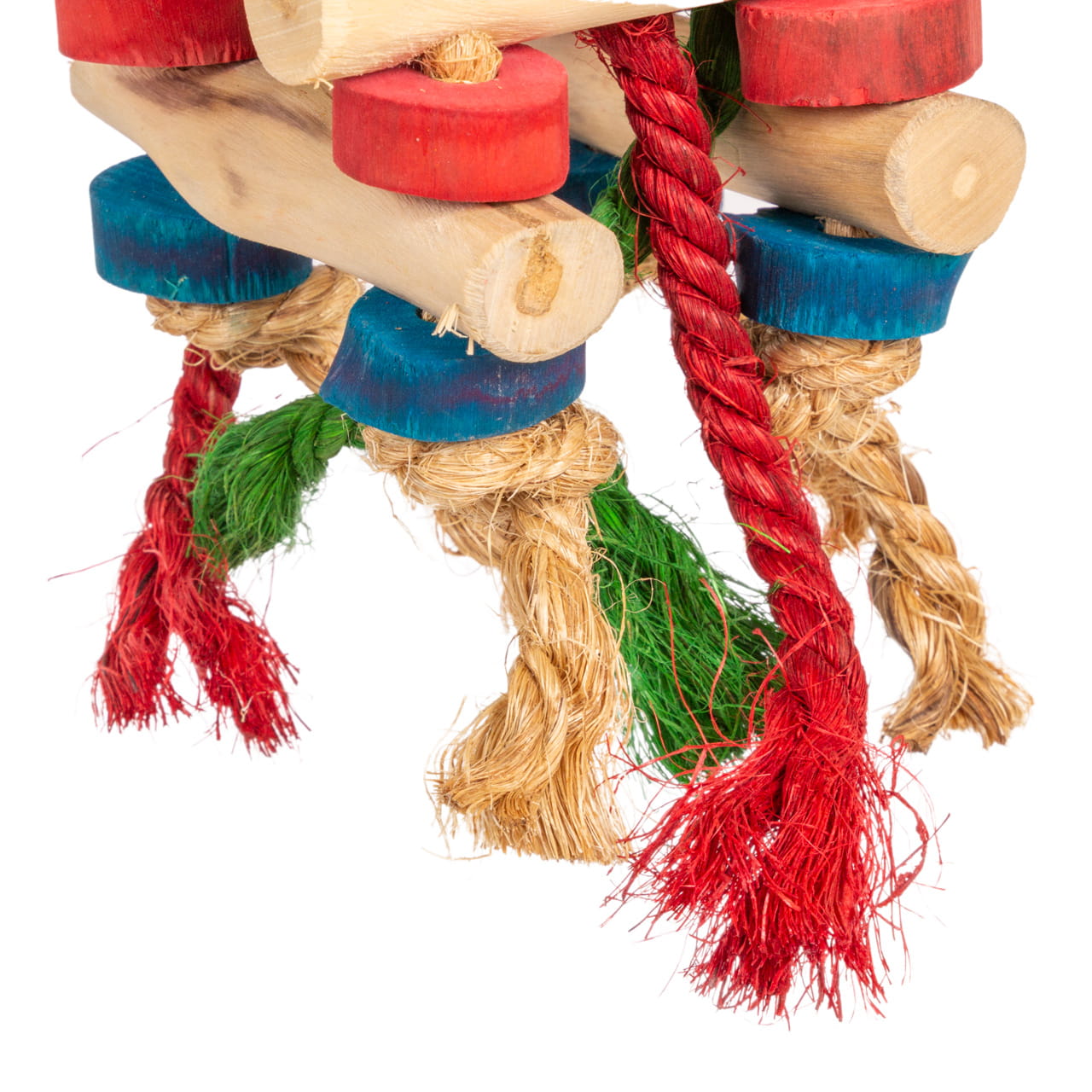 Pevná konstrukce: Hračka je vyrobena z pevných materiálů, což zaručuje její odolnost a odolnost vůči intenzivnímu hraní. Papoušci mohou bezpečně prozkoumávat různé prvky hračky, aniž by se museli obávat jejich poškození.
