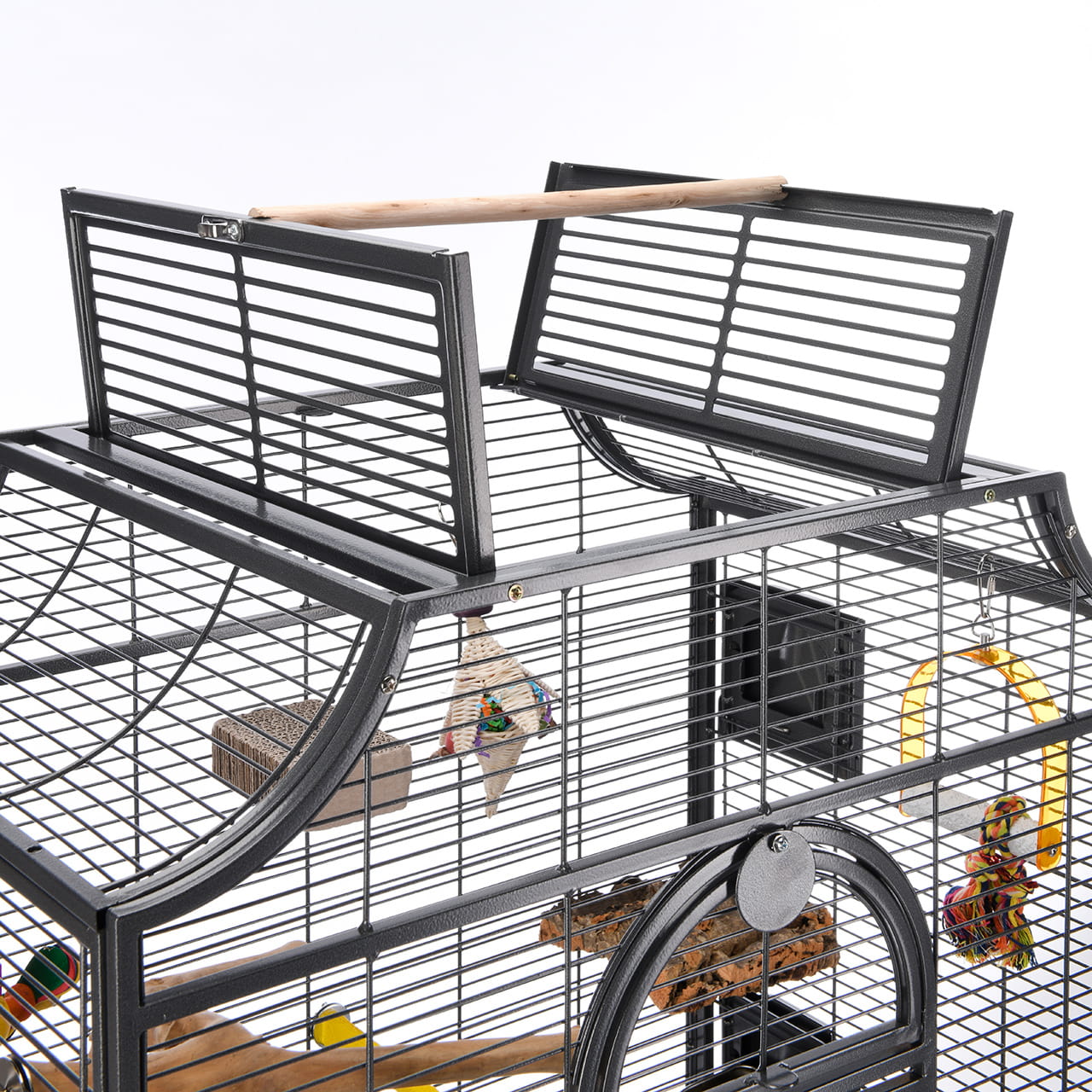 Střechu lze otevřít a vytvořit tak otevřený prostor pro papouška.