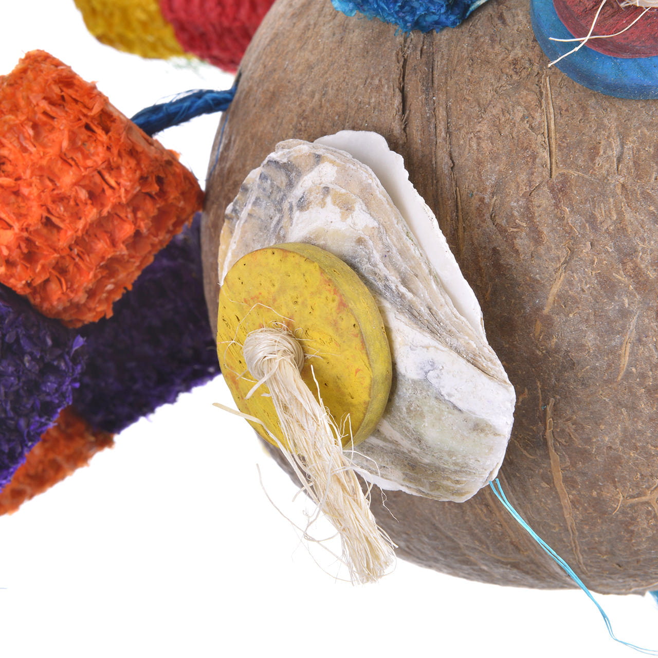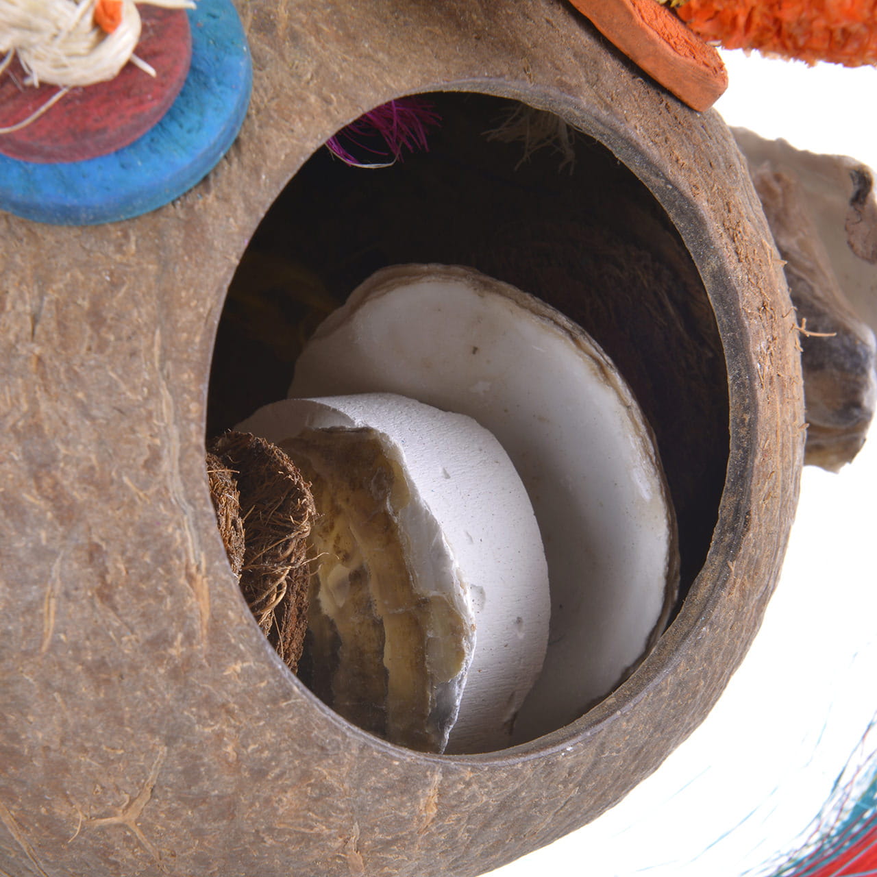 Tato jedinečná hračka nabízí vašemu papouškovi mnoho možností zábavy a škrábání, takže se nikdy nebude nudit. Hračky uvnitř kokosu lze vyměňovat, což vaší papoušce přináší nekonečné potěšení z objevování nových prvků. Sázejte na přírodní řešení a postarejte se o aktivitu a radost svého opeřeného přítele díky vydlabanému kokosu!