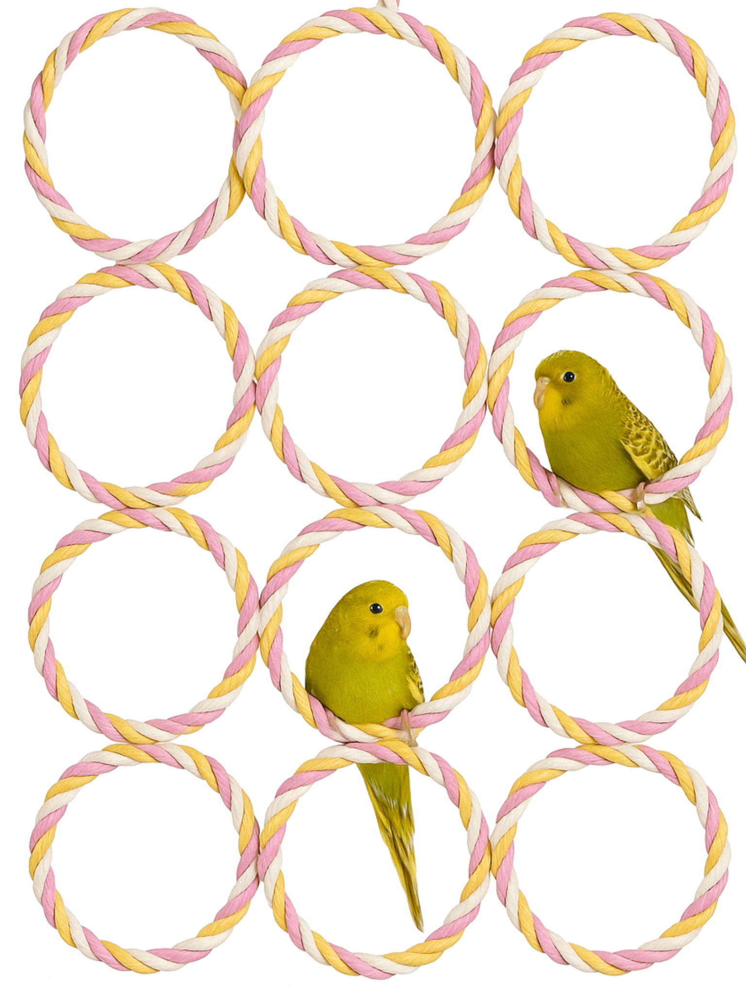 Víceúrovňová hračka z barevných, pletených koleček je skvělou volbou pro aktivní papoušky, jako jsou nimfy, alexandry, vlnkované papoušky nebo nechtěnky. Konstrukce připomíná závěsné „hřiště“, které můžete připevnit k oknu, kleci nebo voliéře.