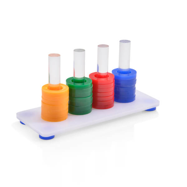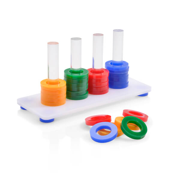 Po naučení by papoušek měl být schopen samostatně skládat kroužky podle barev.