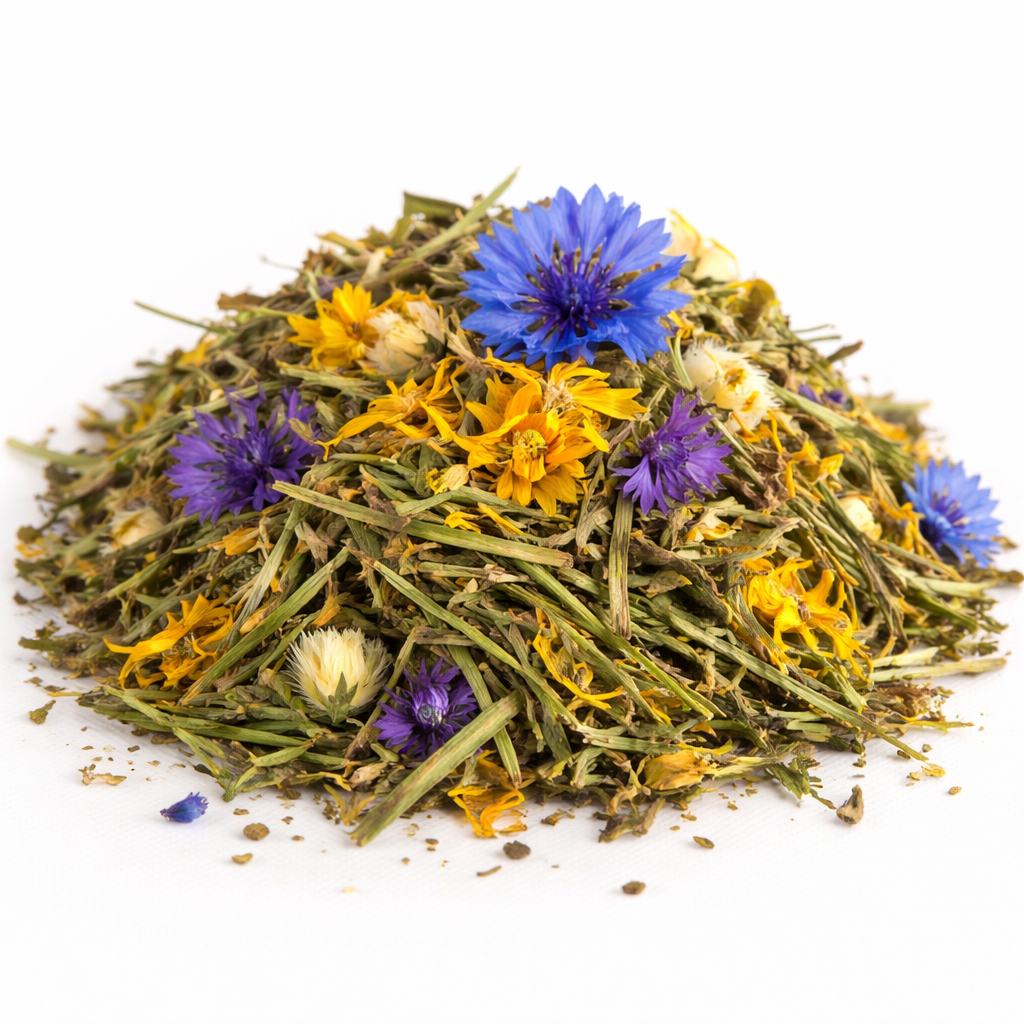 Luční hostina s chrpou je přírodní směs bylin, trav a květů vytvořená pro králíky a morčata. Směs vychází z přirozeného prostředí pastvy a přináší rozmanité chutě i aroma.