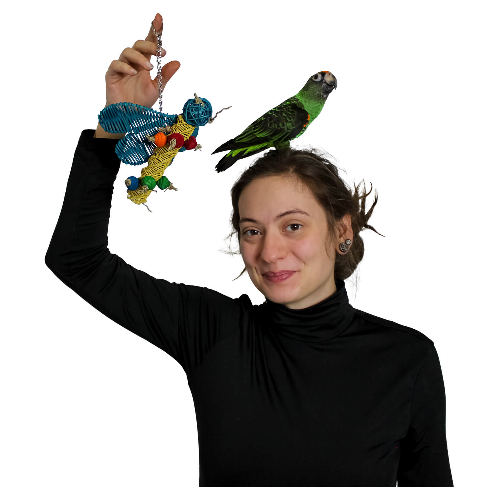 2. Různé materiály – hračky obsahují mnoho různých prvků, které mají různou tvrdost. Papoušek tak může okusovat a zároveň cvičit zobák! Díky různým texturám papoušek poznává svět a může si sám vybrat, kterými prvky hračky se dnes bude zabývat.