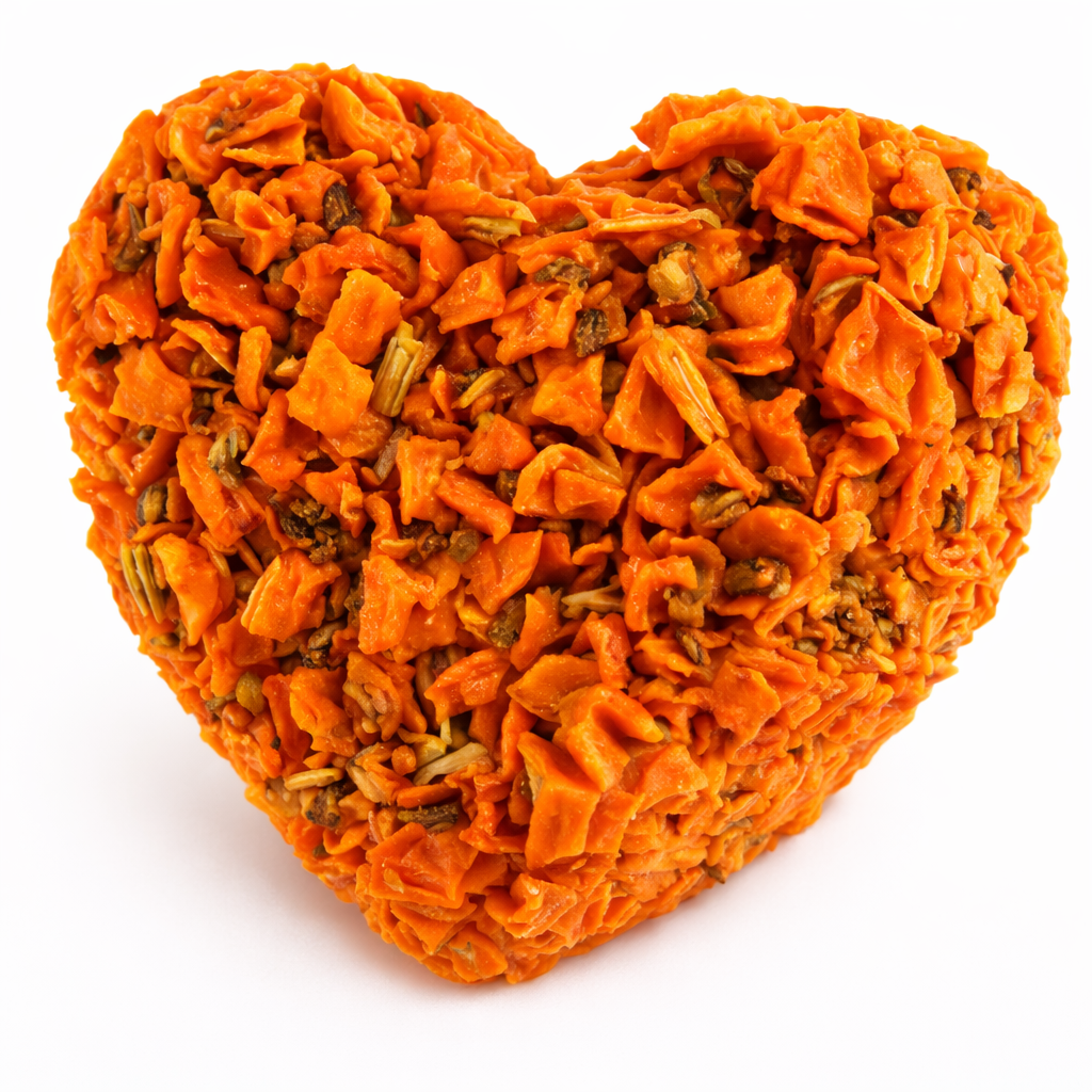 Mrkev je přirozeným zdrojem beta-karotenu a vlákniny a její jemně křupavá struktura podporuje okusování a aktivitu zvířat. Tvar srdíčka usnadňuje podávání a zvyšuje ochotu zvířat pochoutku přijímat.