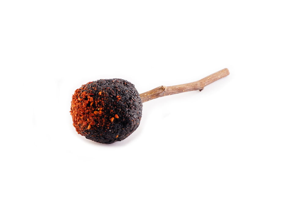 Ovocná svačinka na špejli s černým rybízem, malinami a jablky , přírodní pochoutka plněná černým rybízem, černuchou, řepou, malinami, ibiškem, jablky (špejle) a škrobem.