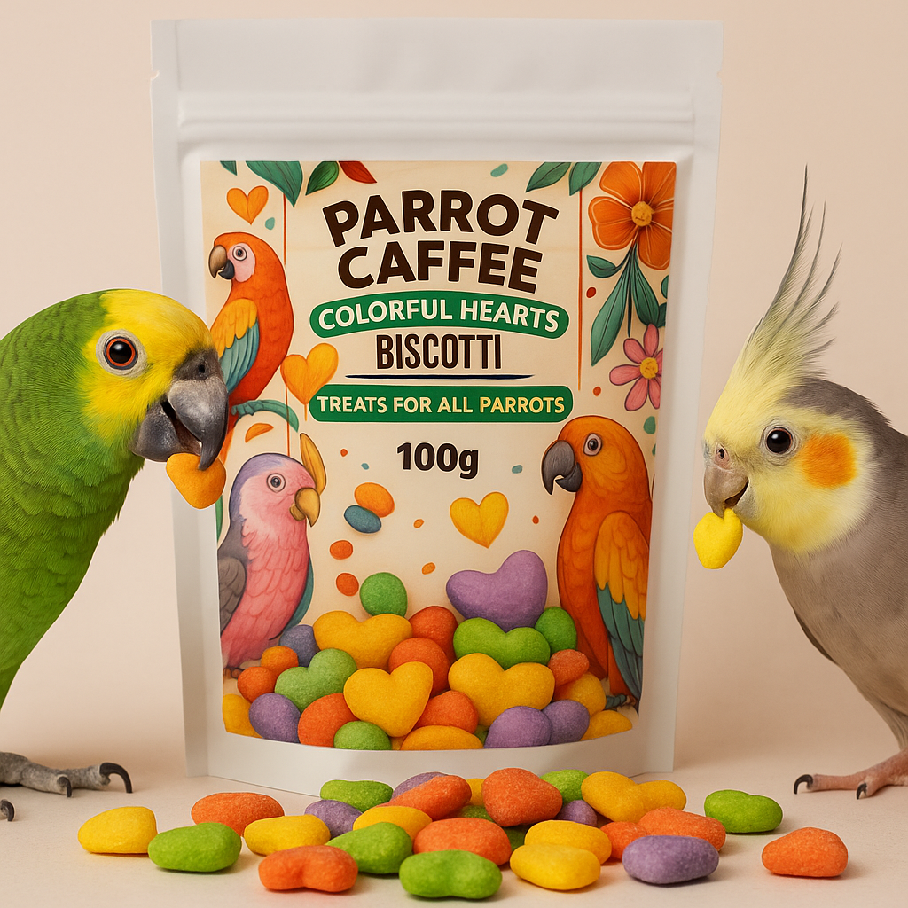 "PARROT CAFFEE – Colorful Hearts Biscotti" jsou výjimečné, barevné sušenky ve tvaru srdíček, vytvořené pro všechny papoušky – od nejmenších po největší. Nejenže jsou chutnou pochoutkou, ale také způsobem, jak vnést do každodenní stravy papouška trochu zábavy, barvy a radosti!