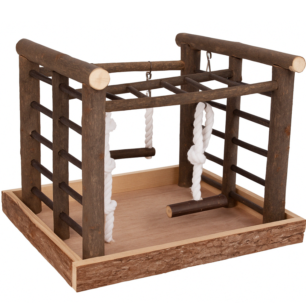 Kompaktní rozměry 36 × 29 × 25 cm umožňují využití hřiště jak ve výběhu, tak jako součást stálého vybavení větší klece. Různé úrovně a konstrukční prvky vybízejí k pohybu a tréninku rovnováhy.