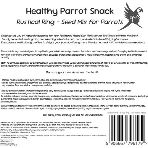 Představujeme Rustikální prsten se zrním, produkt značky Parrot Planet vytvořený s ohledem na zdraví a štěstí vašeho papouška. Jedná se o jedinečnou pochoutku, která papouškům poskytuje nejen výživné látky, ale také zábavu, podporuje jejich přirozené instinkty a každodenní aktivitu.