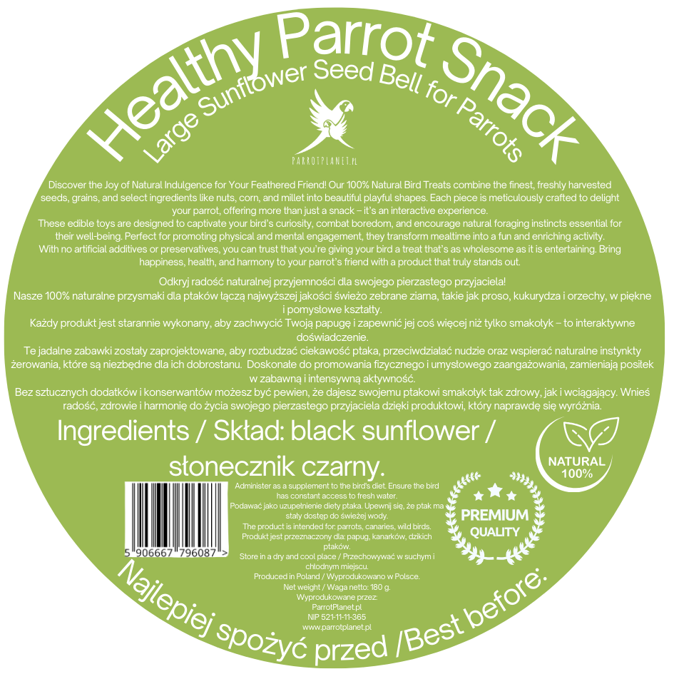 Objednejte si ještě dnes a udělejte svému mazlíčkovi radost, aby byl šťastný, zdravý a plný energie! Velký zvonek ze slunečnice značky Parrot Planet je nejlepší volbou pro náročné papoušky a jejich majitele.