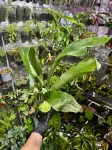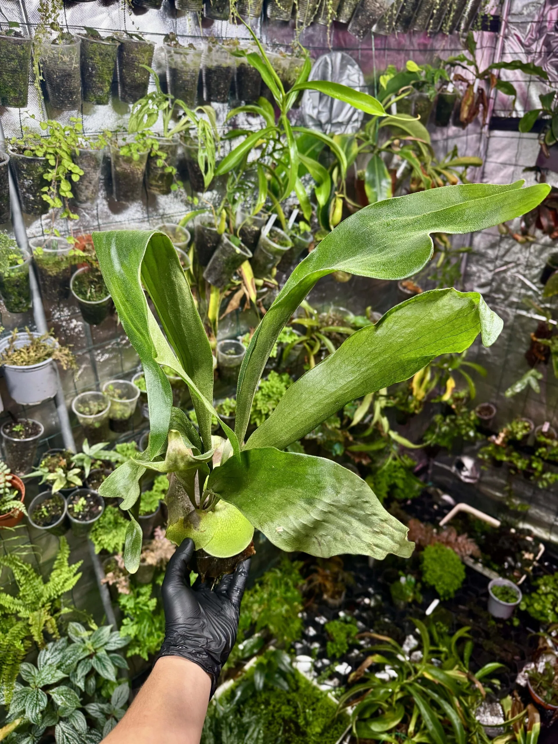 Zdravou sazenici Platycerium bifurcatum, připravenou k upevnění na podložku nebo k dalšímu pěstování. Rostlina je pečlivě zabalena pro přepravu.