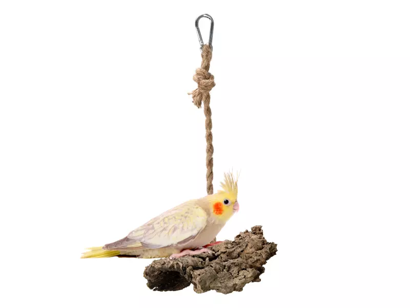 Hra a kousání: Houpačka z kousku kůry korkového dubu je skvělým kousátkem, které papouškovi umožňuje přirozeně obrušovat zobák.