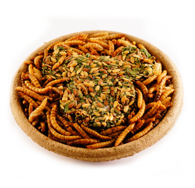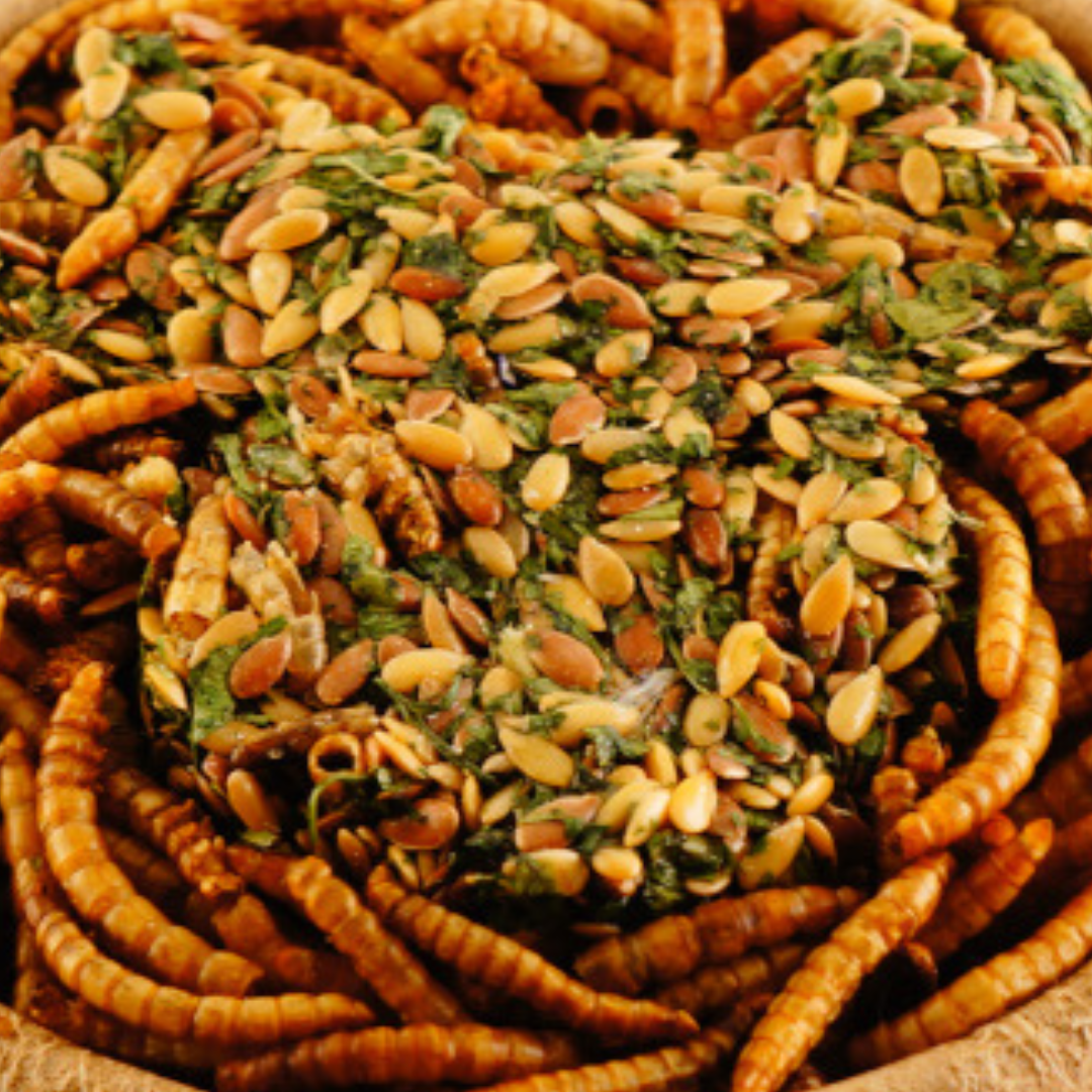 Složení: Larvy moučky, lněné semínko, hnědé lněné semínko, petržel, škrob
