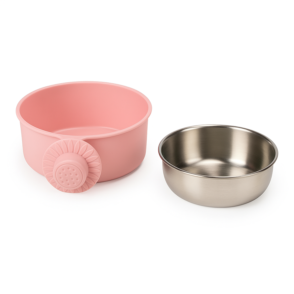 Ideální pro každodenní podávání krmiva nebo vody. Vybavena vyjímatelnou vložkou z nerezové oceli – stačí ji vyjmout, umýt a hotovo. Miska se navíc připevňuje k tyčím klece pomocí knoflíku ve tvaru květu – stabilně a bez posouvání.