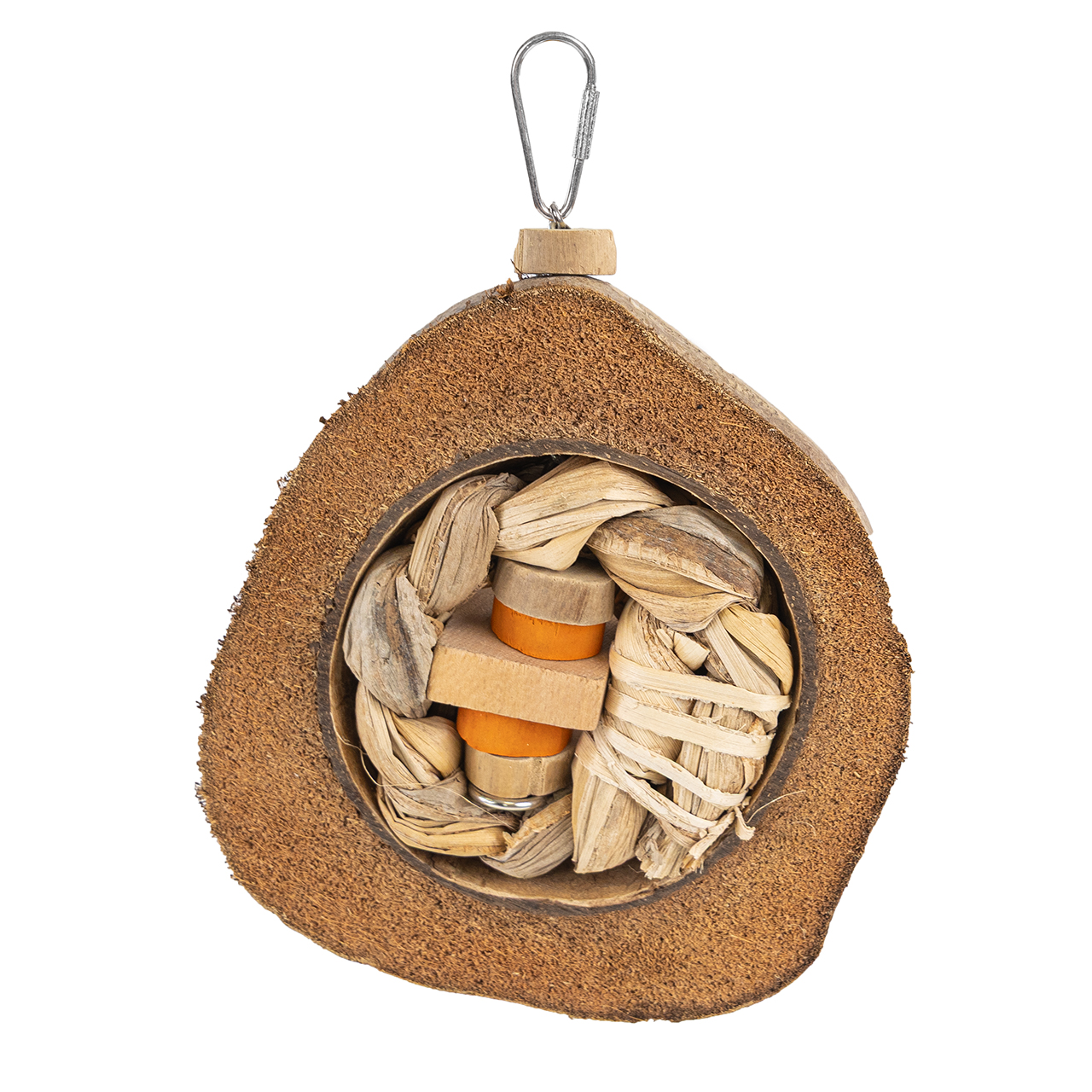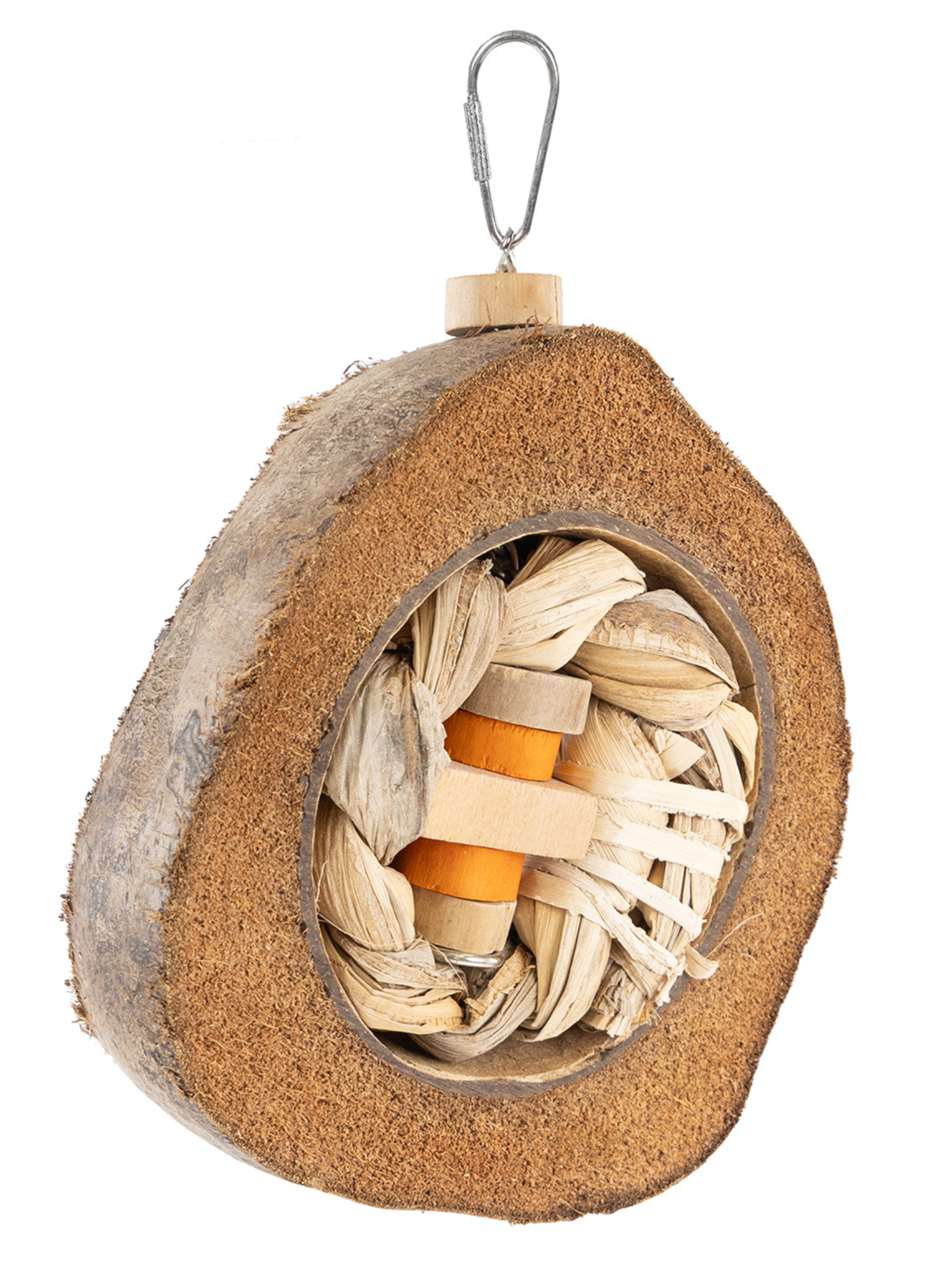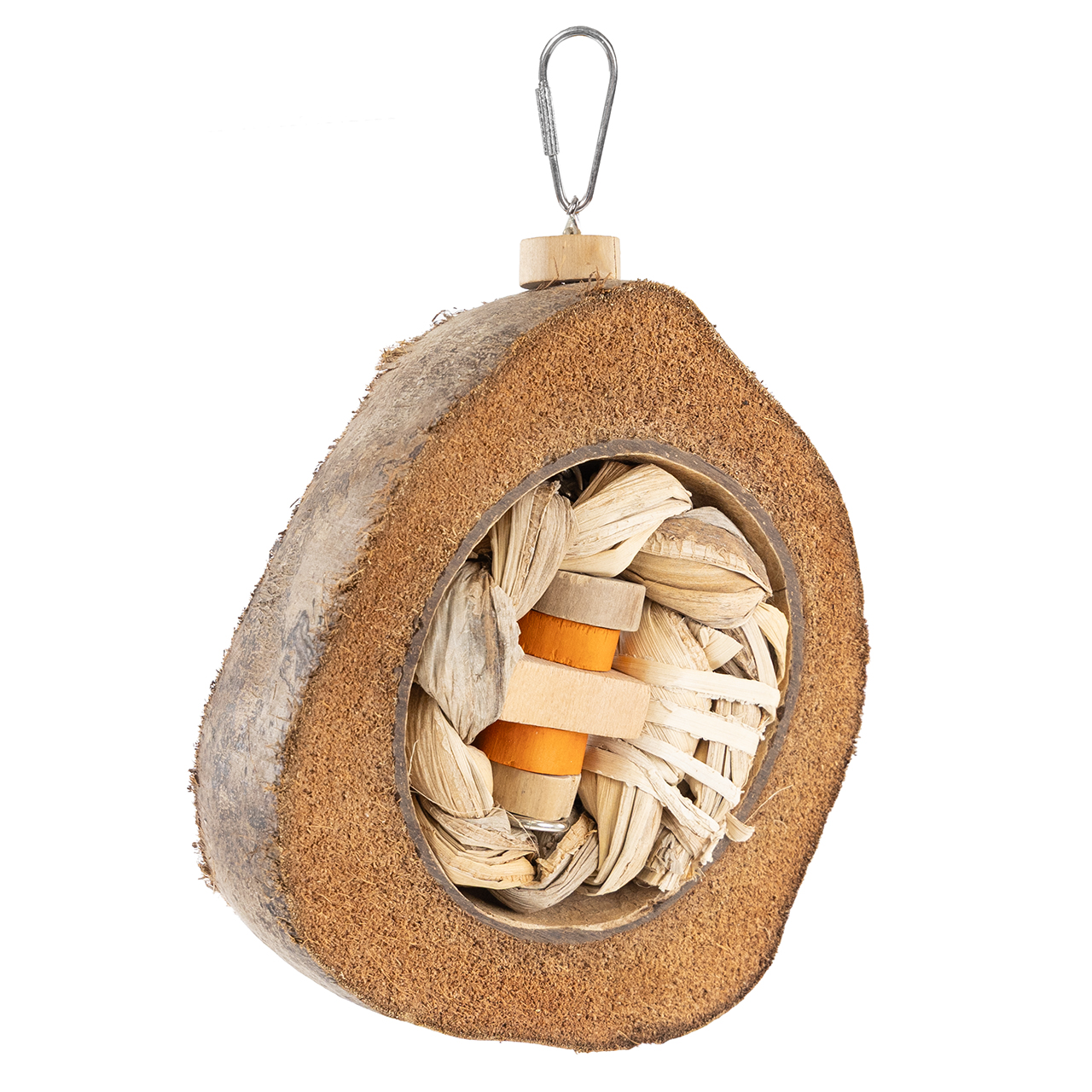 Srdcem hračky je mimořádně silný, pevný štít z pravého kokosu – ideální pro intenzivní klování. Do něj jsou vpleteny prvky z palmových listů a kousky tvrdého dřeva, které poskytují rozmanité textury, které ptáci milují rozebírat. Celá hračka je zavěšena na odolném řetězu z nerezové oceli a zakončena bezpečným karabinou pro snadné připevnění.