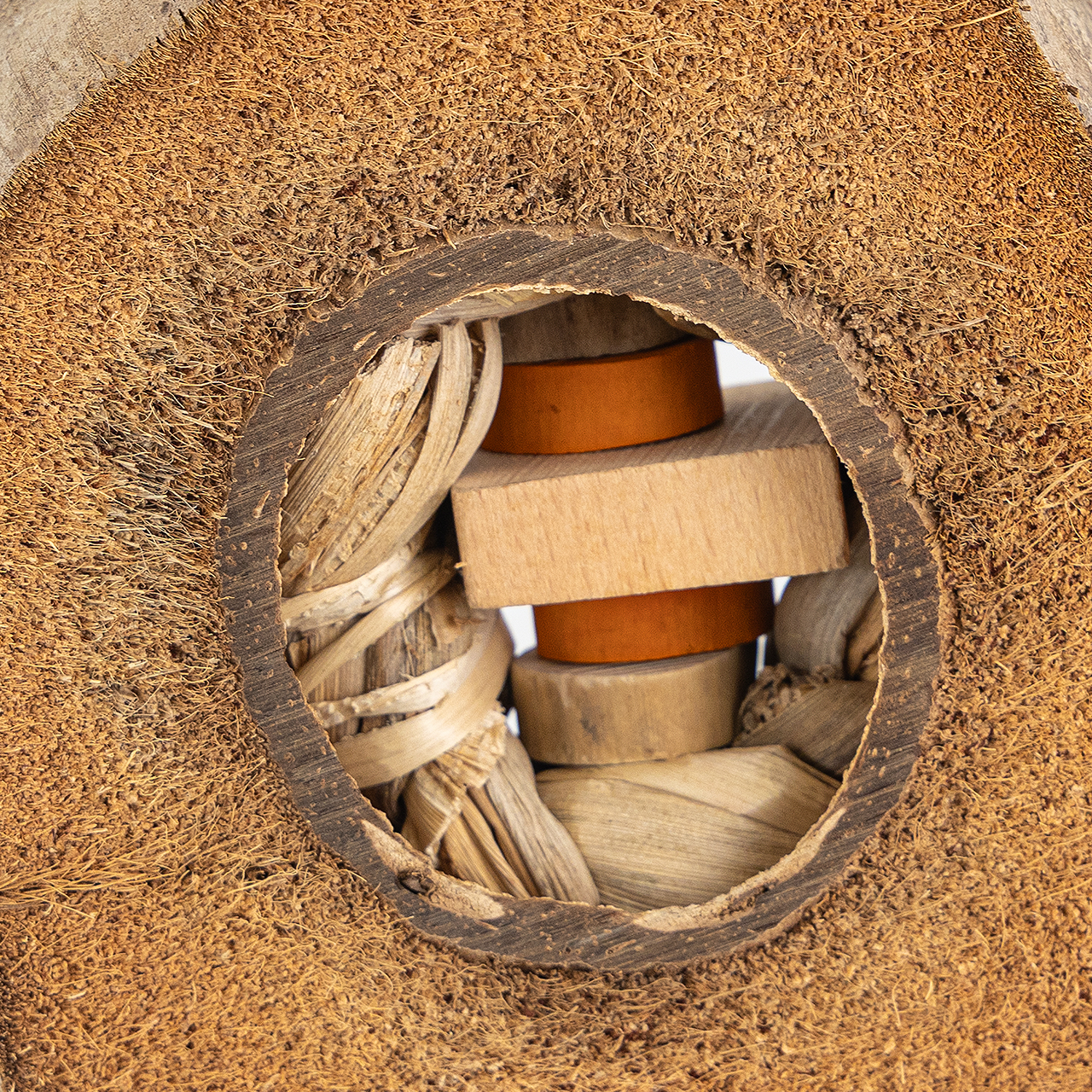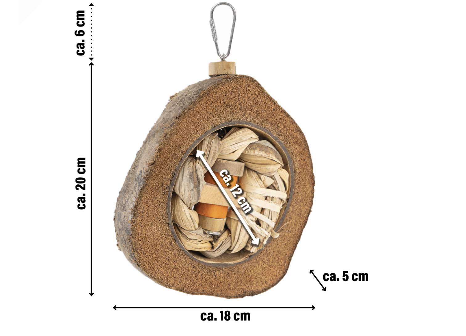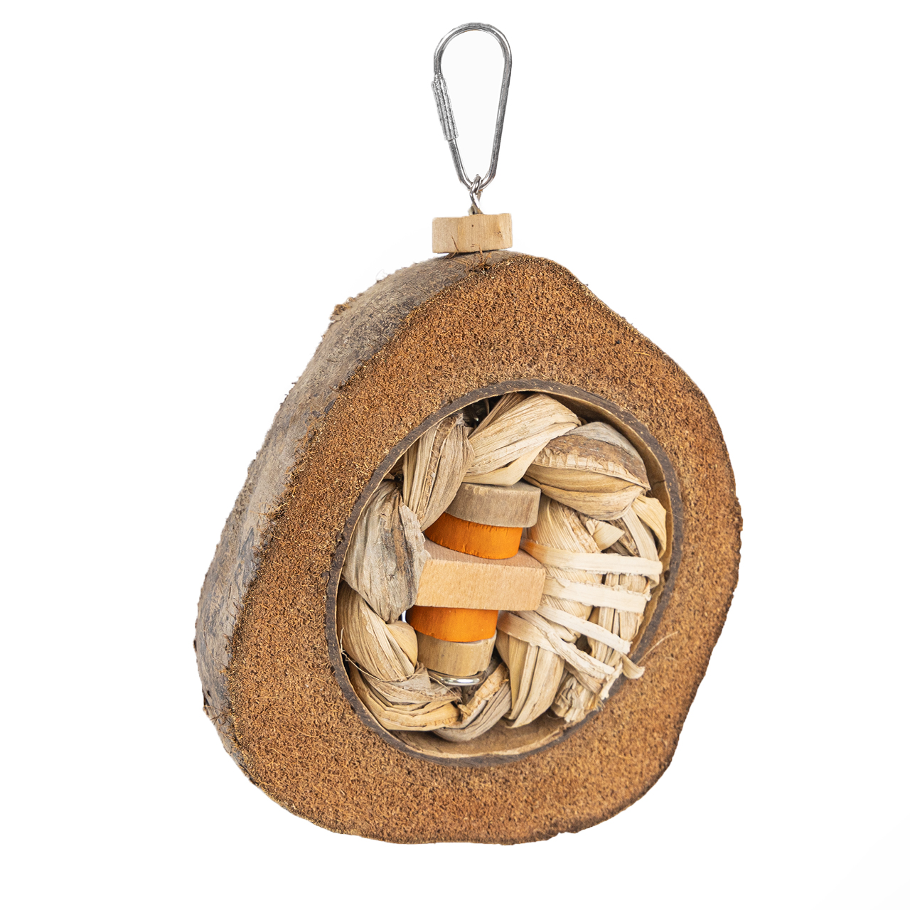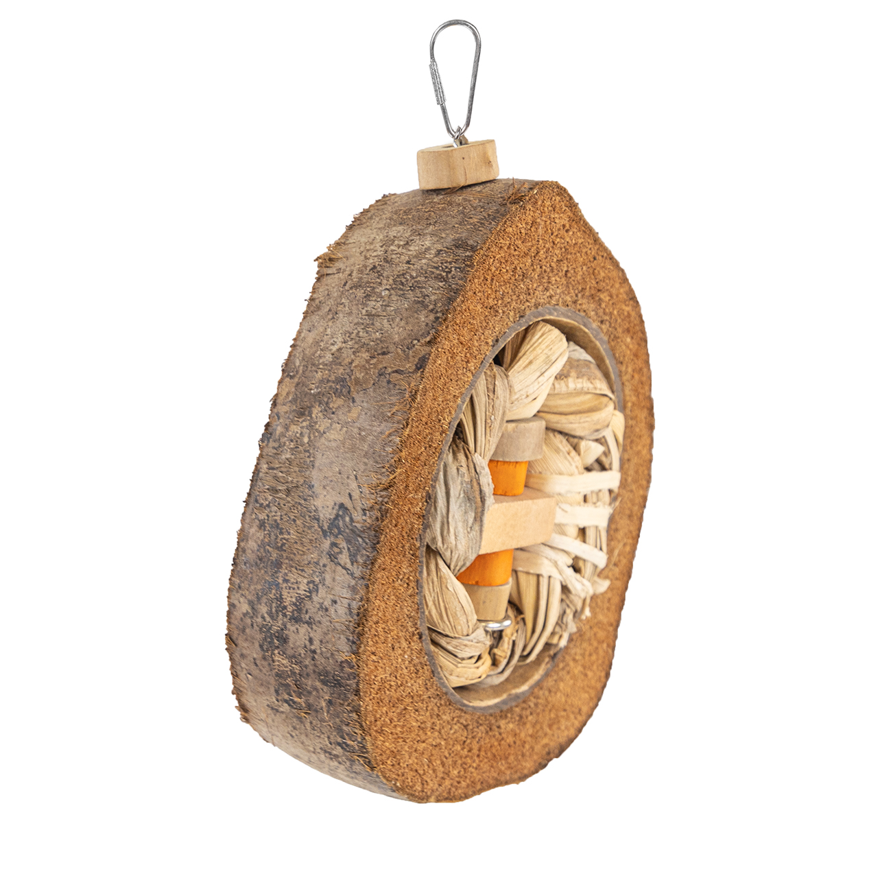 Srdcem hračky je mimořádně silný, pevný štít z pravého kokosu – ideální pro intenzivní klování. Do něj jsou vpleteny prvky z palmových listů a kousky tvrdého dřeva, které poskytují rozmanité textury, které ptáci milují rozebírat. Celá hračka je zavěšena na odolném řetězu z nerezové oceli a zakončena bezpečným karabinou pro snadné připevnění.
