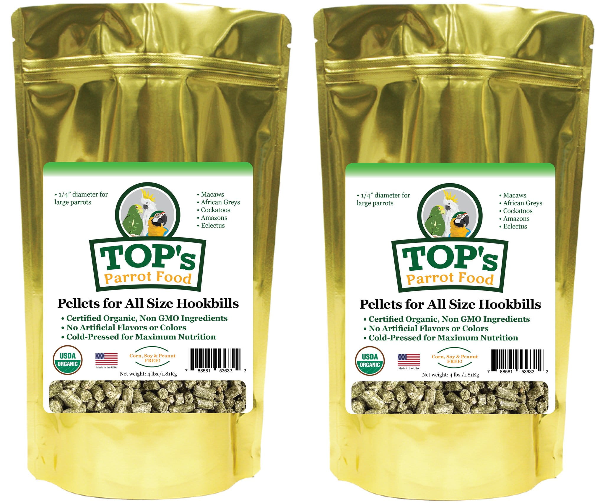 TOP's Parrot Pellets ™ má certifikát USDA Organic a je ideální pro papoušky všech velikostí, od ary po vlnkované papoušky. Tyto charakteristické granule o průměru 0,63 cm jsou vyrobeny výhradně z organických surovin pocházejících ze Spojených států a jsou lisovány za studena, aby si zachovaly všechny přírodní živiny.