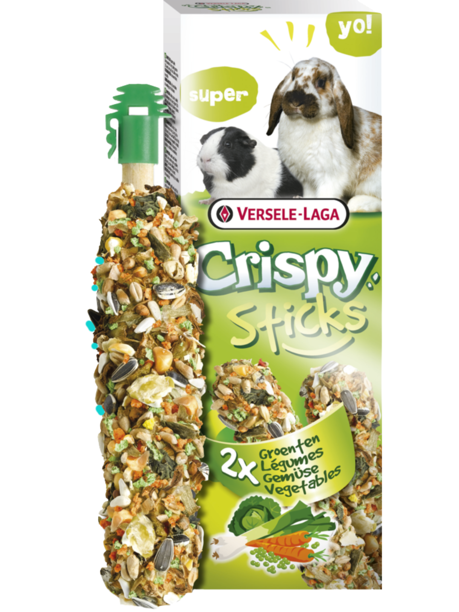 Versele Laga Sticks Rabbits-Guinea Pigs Vegetables jsou chutné a zdravé pamlsky určené pro domácí králíky a morčata. Pečené tyčinky obsahují mrkev, hrášek, pórek a zelí, které vašim mazlíčkům dodají přirozenou chuť zeleniny. Tyčinky se snadno připevňují do klece a jsou baleny ve fólii typu Freshpack, která zaručuje jejich dlouhodobou čerstvost a křupavost.