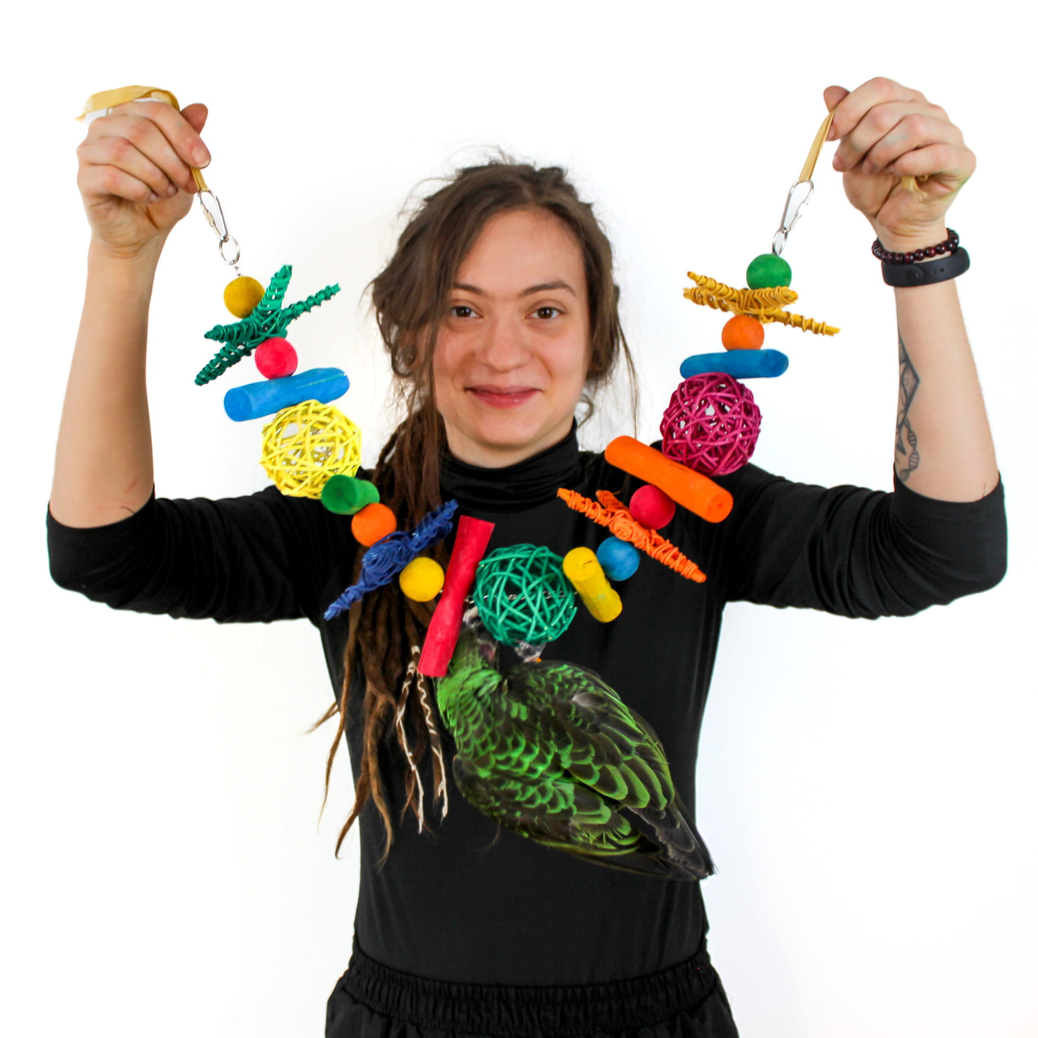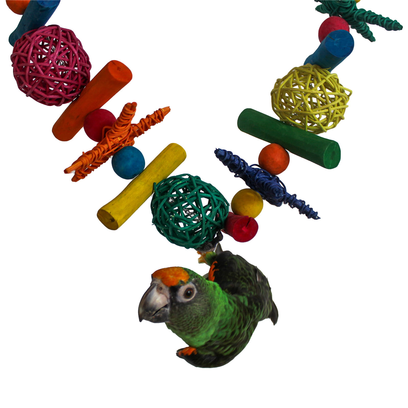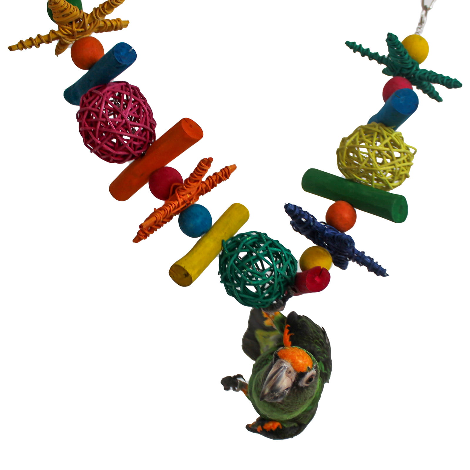 3. Různé materiály – hračky obsahují mnoho různých prvků, jako je ratan nebo proutí. Papoušek tak může okusovat a zároveň cvičit zobák! Díky různým texturám papoušek poznává svět a může si sám vybrat, kterými prvky hračky se dnes bude zabývat.