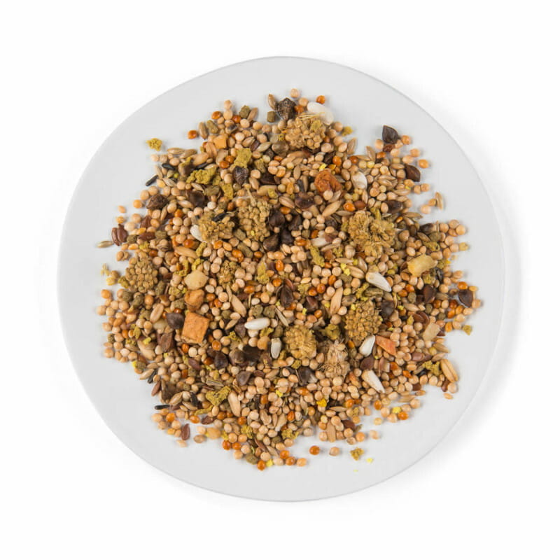 - Obsahuje 3 % lněného semínka, 3 % prosa, 2 % semínka světlice barvířské, 0,75 % jablek, což přispívá k pestré a chutné stravě.