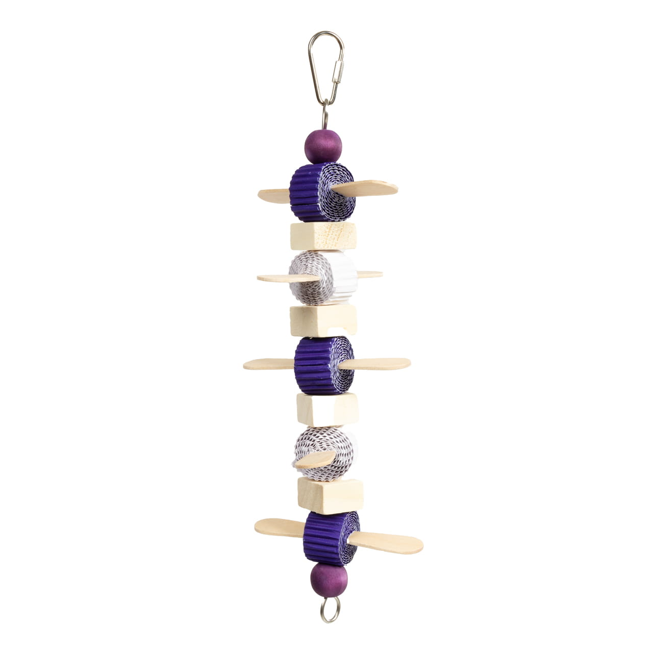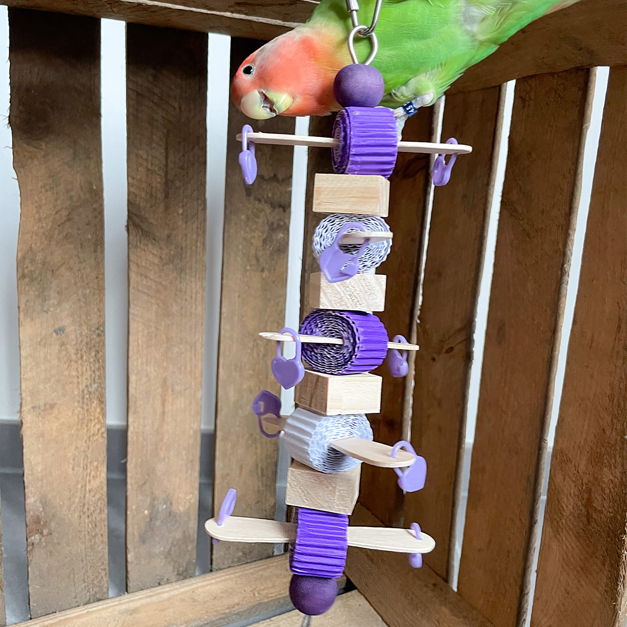 Woody Whirl je krásně navržená hračka pro ptáky ve tvaru špízu, ručně vyrobená s cílem zabavit vaše opeřené přátele. Hračka se skládá z pečlivě vybraných materiálů, jako jsou dřevěné tyčinky, vlnité lepenkové válečky a jednotlivé dřevěné kostky. Fialové zbarvení získané pomocí potravinářského barviva dodává hračce atraktivní vzhled.
